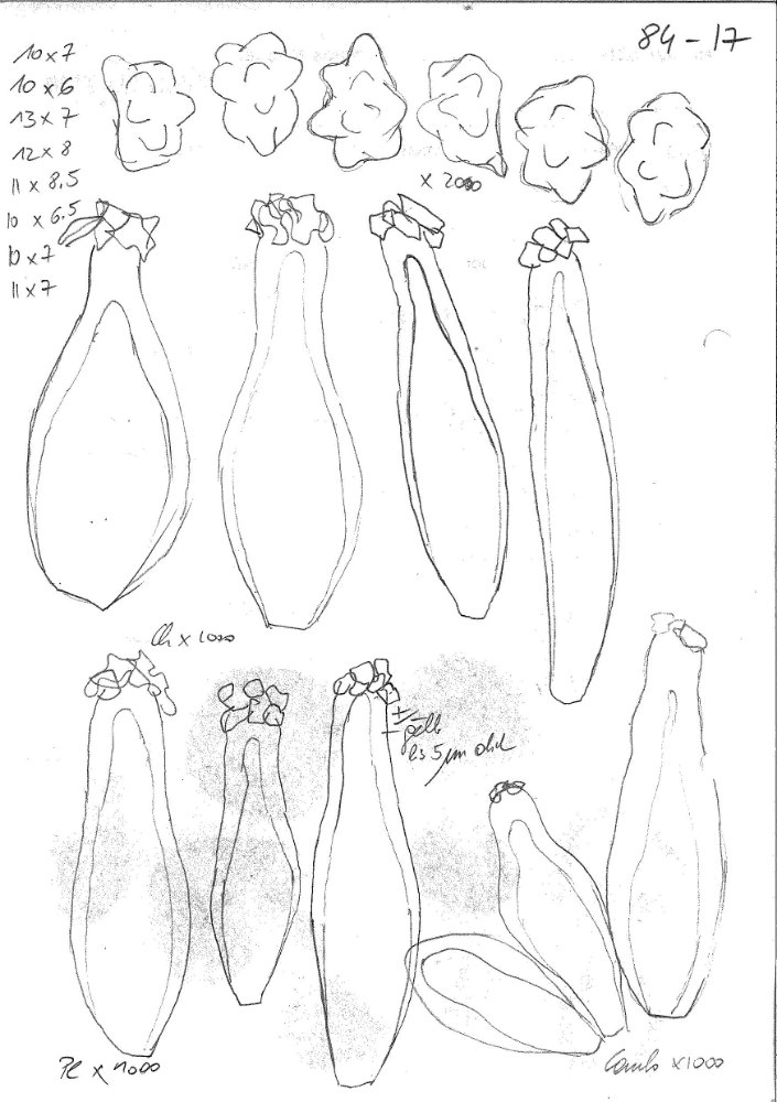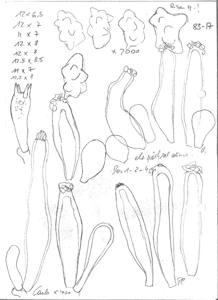 Sporen groß mit vereinzelten Riesensporen, Bas. (1-, 2-)4-sporig, Cheilos eher dünnwandig, Pleuro ähnlich