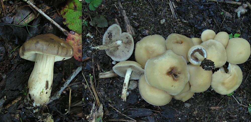 Der fleischige kräftige Pilz links auf dem Foto weist alle Merkmale von Agrocybe praecox auf, aber der Ring fehlt.