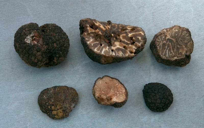 gestern wurde mir eine Trüffel gebracht, die aufgrund der feinstacheligen Sporen in Kombination mit den restlichen Merkmalen – eher kleine Fruchtkörper mit flach warziger Peridie und grob gewundener Gleba – Tuber brumale zuzuordnen ist. Ich weiß aus verschiedenen Quellen, dass die Art zumindest in Graz und südlich davon in der Steiermark keine große Rarität ist. Die gezeigten Fruchtkörper stammen aus der Südsteiermark. Als "normaler" Schwammerlsucher findet man solche Sachen natürlich kaum, und so verwundert es auch nicht, dass in der Ö-Datenbank bislang noch keine Nachweise von T. brumale verzeichnet sind.