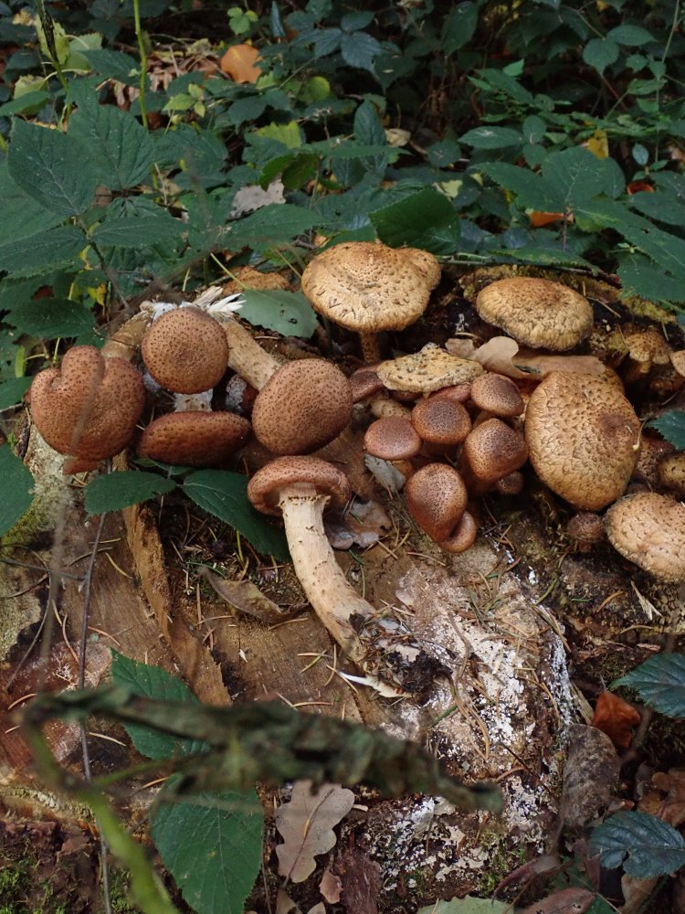 Bei dieser Verschwisterung von Armillaria und Pholiota würde ich gerne wissen, wie es denn im Substrat aussieht. Wachsen die Hyphen durcheinander, oder bleiben sie in ihrem Rayon? Gloeoporus dichrous wuchs an der Unterseite einer Populus tremula meterlang! Und die Fruchkörperlänge dieser Stereum rugosum, das Bild zeigt nur einen Teil, ist auch rekordverdächtig. Einen schönen Mittag, Heinz