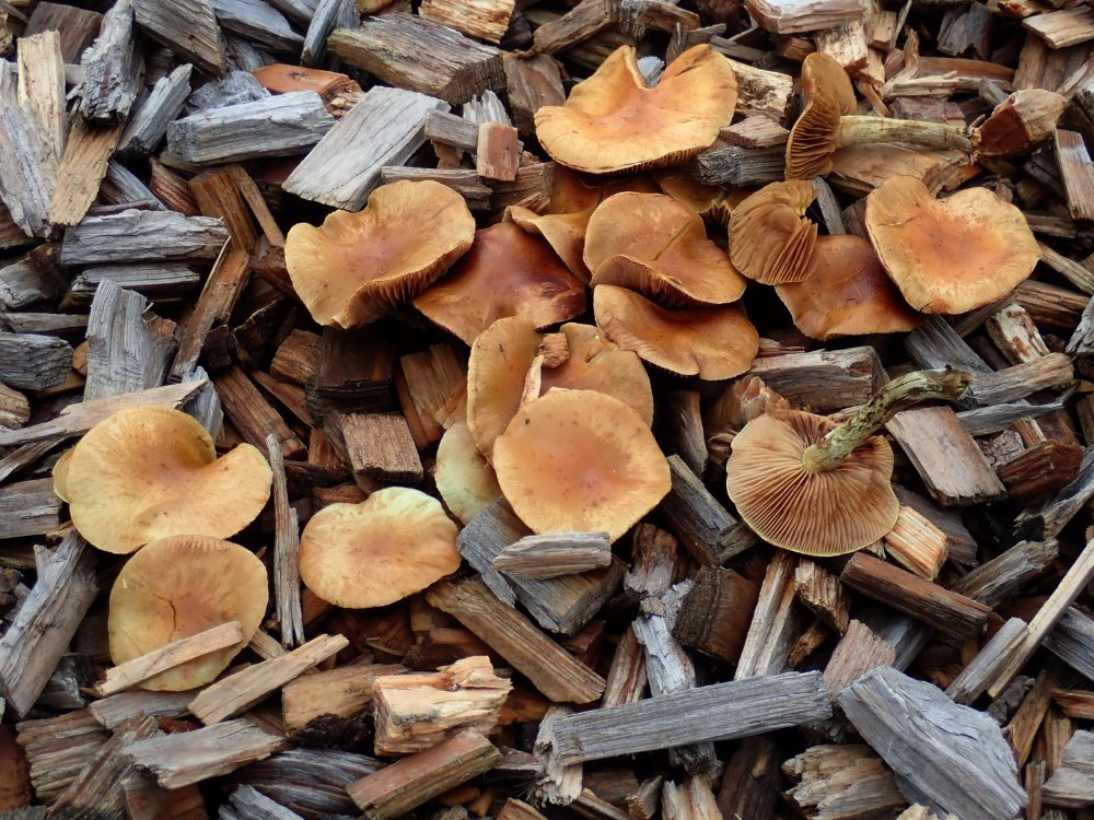 Gestern holte man mich zu einem Kindergarten; dort wuchsen auf dem Holzmulch (wohl Nadelholz) des Spielplatzes hunderte Pilze,