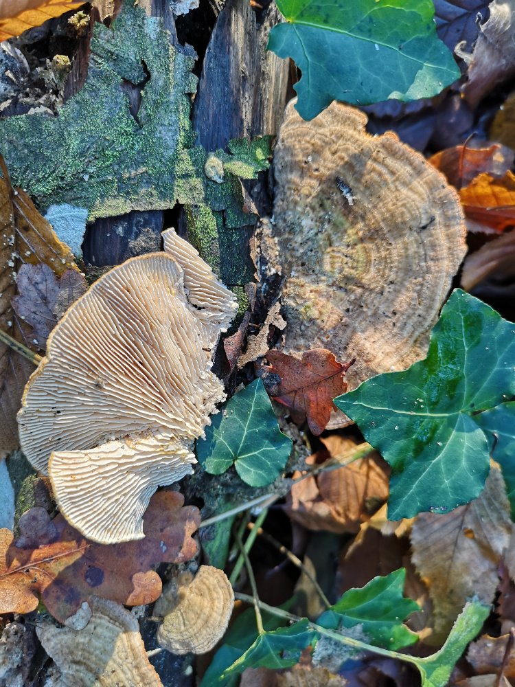 Der weiße parasitische Pilz war dermaßen klein und die Lichtverhältnisse schlecht, dass ich mit meiner Handykamera kein gutes Bild machen konnte. Generell hat mich das interessiert, weil ich noch nie so einen Parasitismus bei den Kleinarten gesehen habe. Vielleicht ist aber auch schon ein Moosüberzug am toten Pilzchen, der parasitiert wurde.