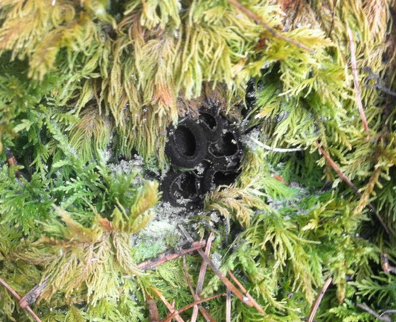 an diesen schwarzen Becherlingen aus der Gattung der Schwarzborstlinge (höchstwahrscheinlich Pseudoplectania nigrella, die häufigste Art) konnte ich nicht vorbeigehen, ohne sie zu fotografieren, auch wenn ich dafür auf das Handy zurückgreifen musste. Sie sind offensichtlich in der vergangenen warmen Wetterphase gewachsen, waren aber aufgrund der kälteren Temperaturen der vergangenen Tage stocksteif gefroren. Nun geht es ja mit den Temperaturen wieder deutlich bergauf, und somit vermutlich auch mit dem Wachstum der Becherlinge, wobei das bei der Trockenheit derzeit ungewiss ist. Der Fundort war jedenfalls typisch für P. nigrella: Eine moosige Forststraßenböschung bei Picea; Bezirk Weiz, Poniglgraben, nahe Buchbauer am Buchberg, 23.2.2019.