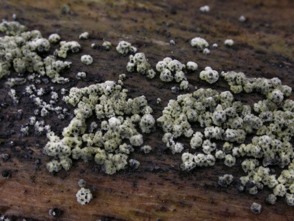 Ein gelbgrüner Pustelpilz der die Stromata von Bertia moriformis parasitiert.