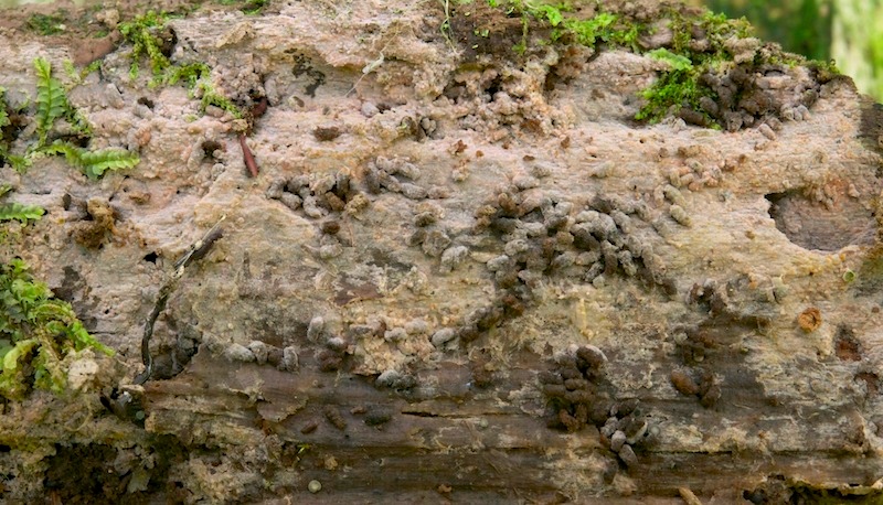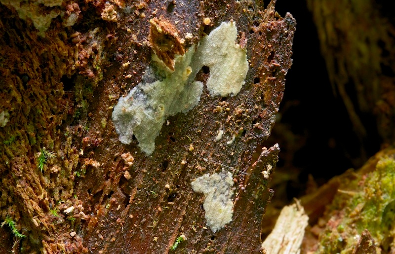 Und schließlich die wohl unscheinbarste dieser Arten, Lobulicium occultum. Sie wächst nur (soweit ich weiß bzw. das bisher selber beobachten konnte) auf der Unterseite braunfauler, stark vermorschter Nadelholzstücke, besonders in alten, liegenden Stämmen. Obwohl ich mehrere Standorte im Kärntner Koralmgebiet nahe der Grenze zur Steiermark kenne (ein Foto habe ich hier bereits gezeigt), ist dies der erste mir bekannte in der Steiermark.
