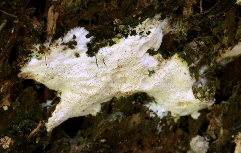 Wieder an einem alten Nadelholzstrunk wuchs ein resupinater, weißlicher Porling mit fransigem Rand (z. T. sind auch Myzelstränge vorhanden). Im Mikroskop muss man genau schauen, um die im Durchmesser weniger als 4 µm messenden Sporen zu entdecken. Die Rede ist von Porpomyces mucidus.