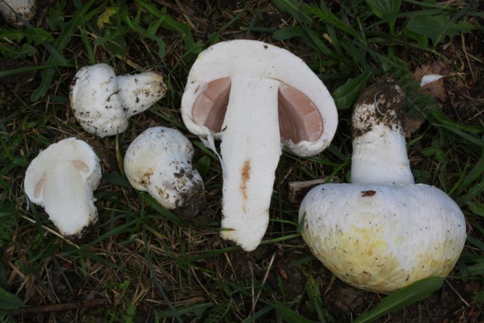 Hier die Fotos dieses besonderen Egerlings, an denen man das Gilben, die Lamellenfarbe, den später hinfälligen Ring (der nur noch ein Band ergibt, das übrigens auch typisch ist, also keine kleine Abrisskante, sondern ein am Stiel anliegender Gürtel) und die Flockigkeit oberhalb des Velum partiale: