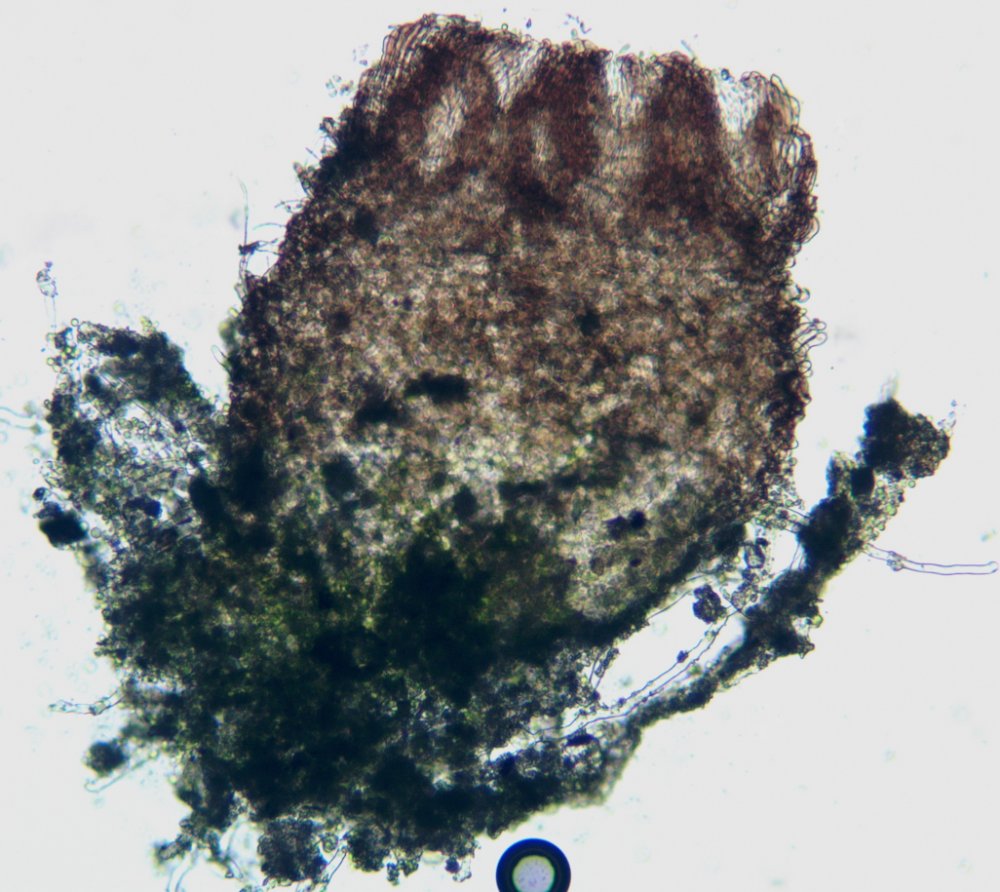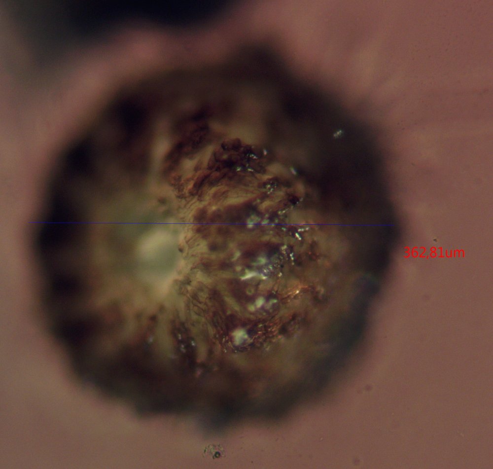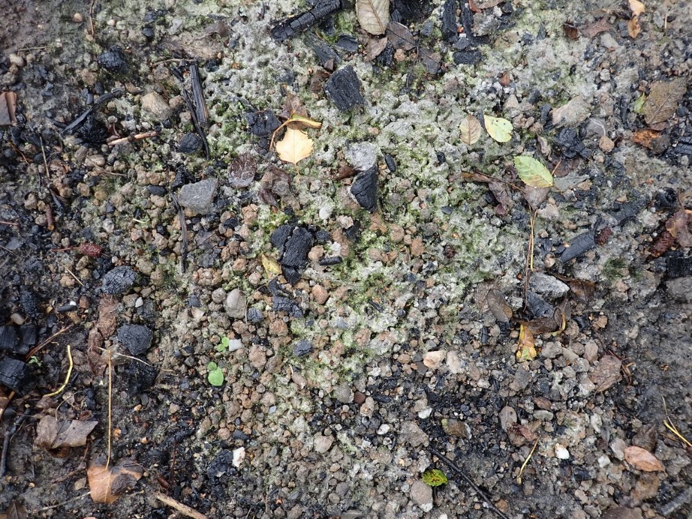 tut sich was. Auf der Asche ist ein grüner Schimmer zu sehen. Auf einem Aschenbrocken entdeckte uner dem STEREO ein winziges pilzliches Etwas. Kennt jemand Ähnliches. Sporen waren nicht zu finden.