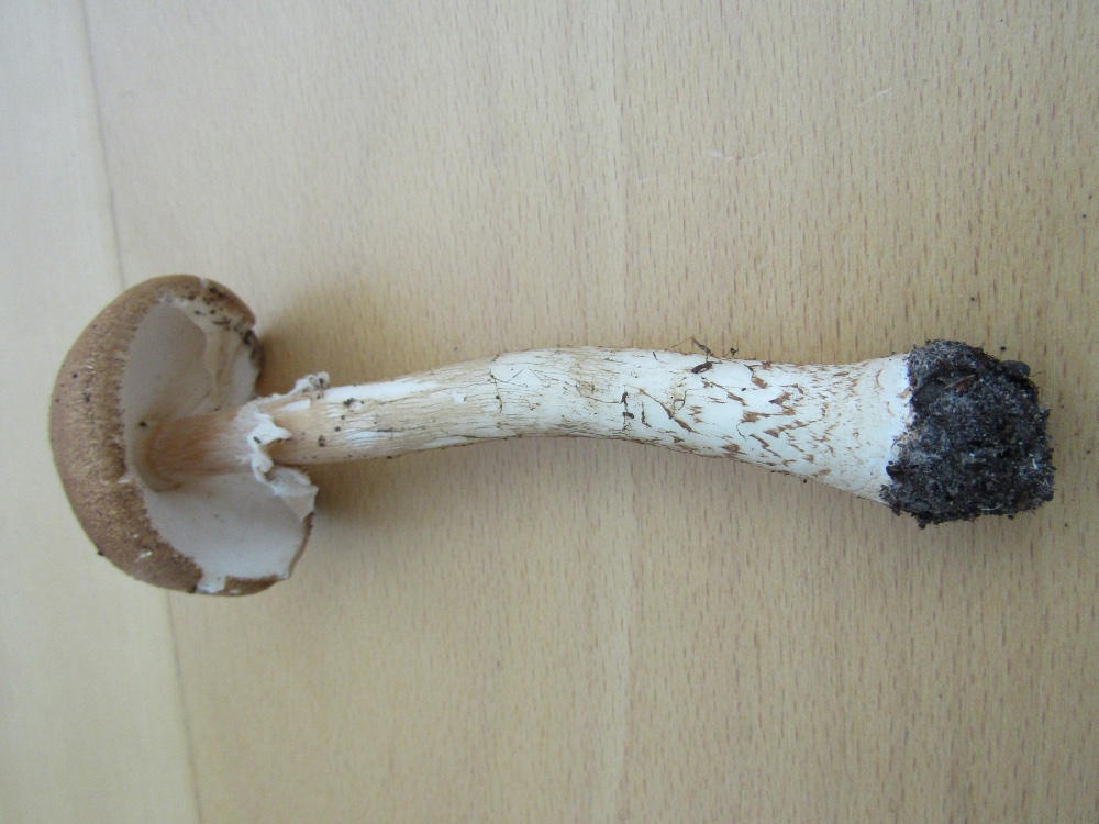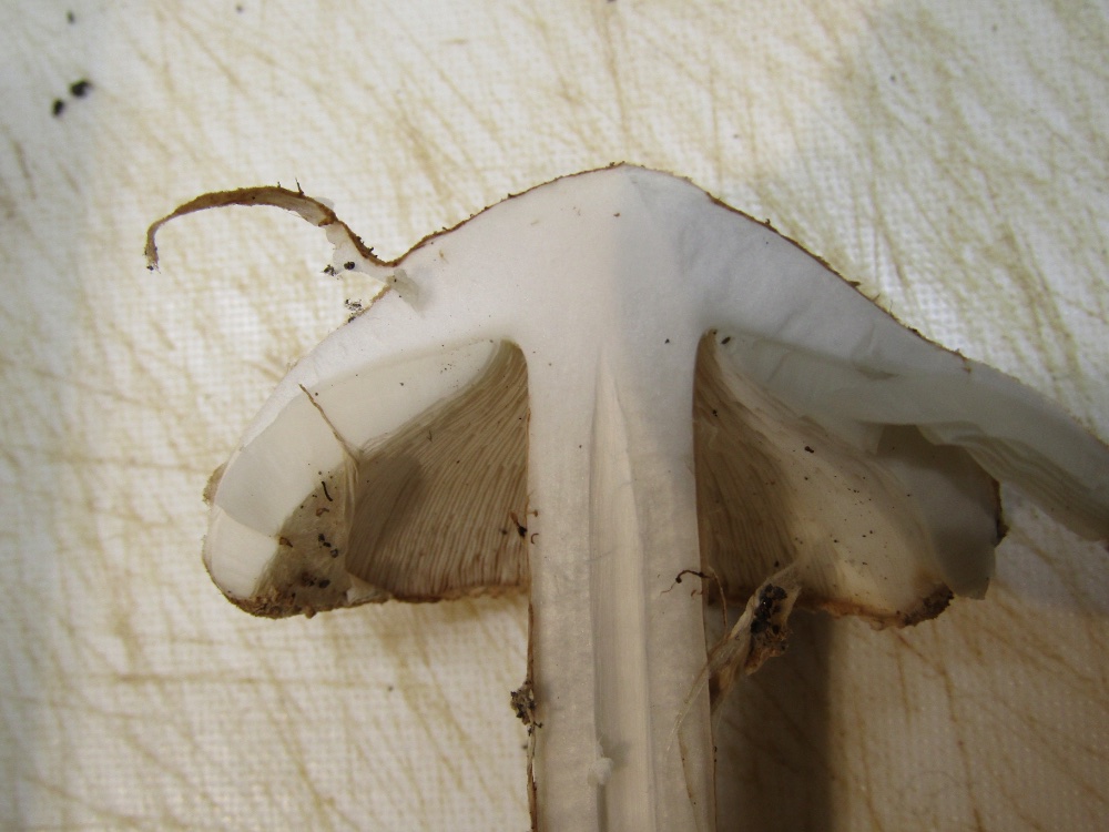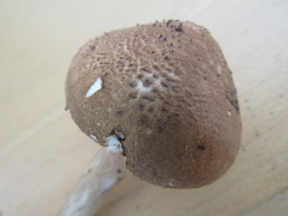 Erinnert irgenwie an Macrolepiota, hat aber keinen Ring. Die gespinstartigen Velumreste sind mit Cortinarien oder Lacrymaria vergleichbar.