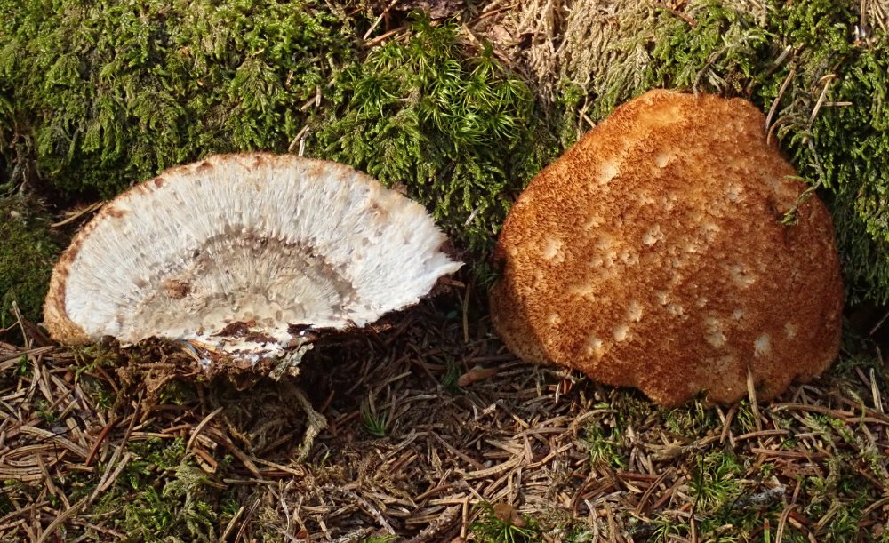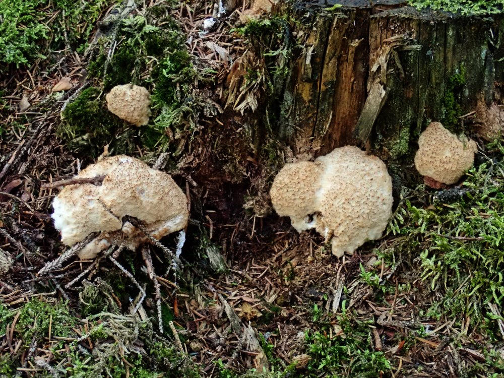 Die Bezeichnung "Weißer Polsterpilz" (Pychogaster albus) wird bei fortschreitendem Alter unrichtig, wie das Bild beweist. Diese aparte Erscheinung ist die Anamorphe vom resupinaten Porling Oligoporus ptychogaster, wobei die fertilen FK oft nicht ausgebildet werden.