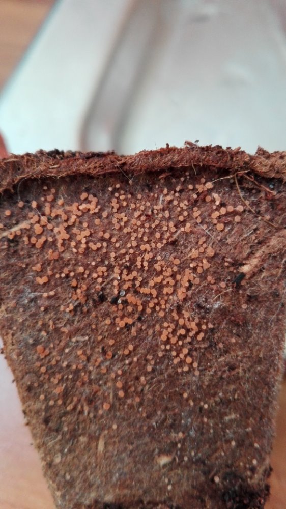 Auch dieses Jahr hat meine Tochter wieder die Saattöpfchen von Billa gesammelt, die aus einem Töpfchen aus vermutlich pflanzlichem Material, einer mitgelieferter Erdtablette und einem kleinen Papiersäckchen mit Samen bestehen. Fünf von diesen Töpfchen waren gemeinsam in einer größeren Schale, sie standen sehr dicht. Als wir sie in eine größere Blumenkiste pflanzten, sahen wir, dass in vieren Kräuter wuchsen, doch im fünften nicht - da wuchsen überall kleine orangene Ascomyceten. Sehr spannend!