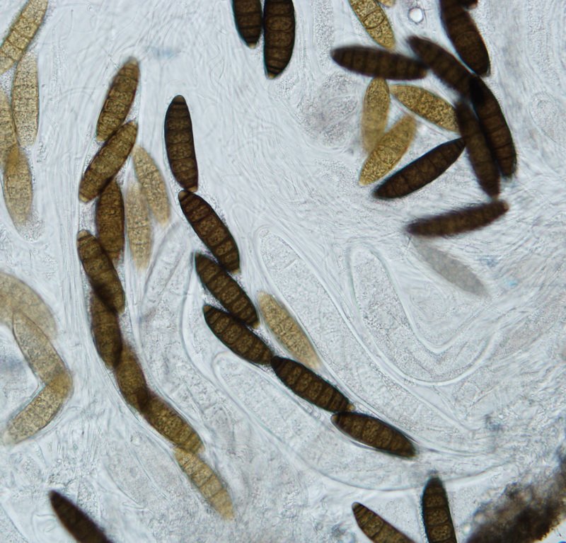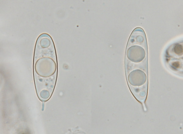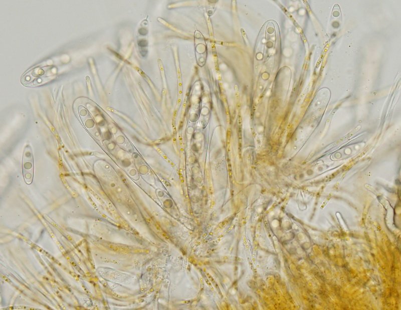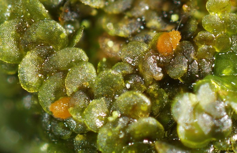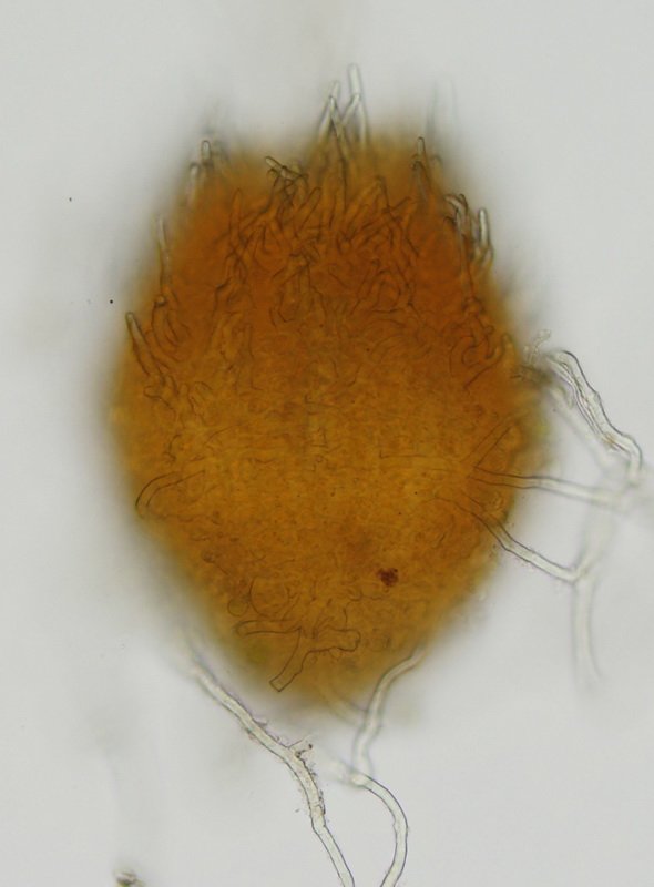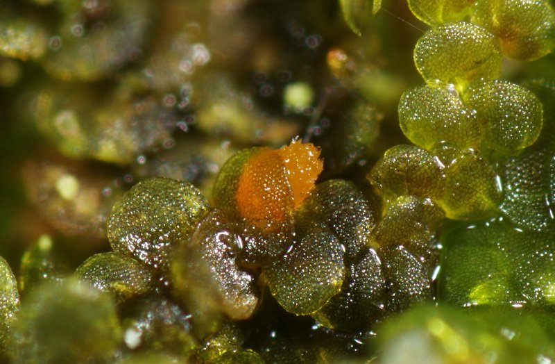 Noch kleiner aber dafür auffälliger gefärbt ist dieser Moosparasit auf Frullania. Besonders interessant finde ich, dass er zur Familie der Pyronemataceae gehört, also ein naher Verwandter zahlreicher bekannter Becherlinge – wie z. B. Scutellinia, Aleuria etc. – ist. Durch die Sporen mit Anhängsel kann man die Art leicht erkennen.