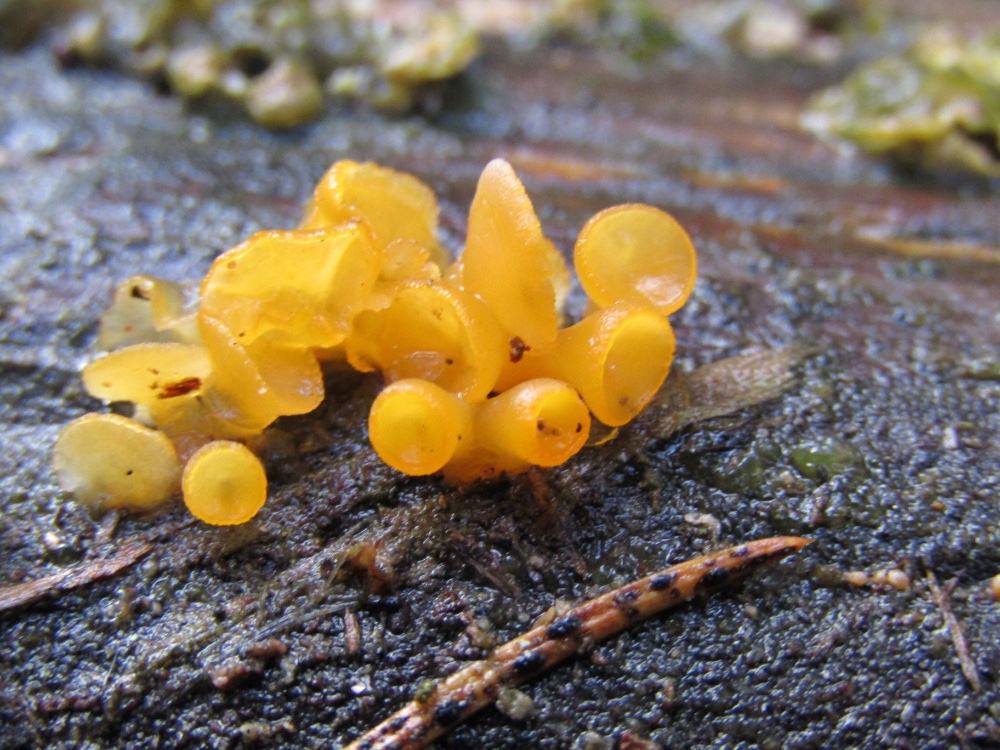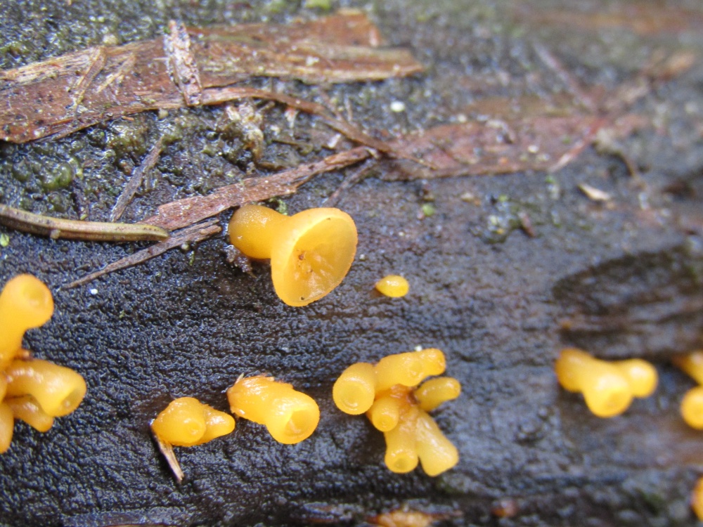 die Feiertage im NÖ Wechselgebiet nutzte ich auch um mich nach Winterpilzen umzusehen. Unterhalb von 900m Seehöhe war es noch schneefrei und da konnte ich auf einem toten Birkenstamm eine für mich neue Art entdecken. Wenn ich mich nicht täusche, müsste sich dabei um Guepiniopsis buccina handeln. Mikroskopisch passen die Strukturen genau zu der Beschreibung auf www.aphyllo.net, allerdings waren die Sporen noch nicht ausgereift. Insgesamt fand ich aber wenig Informationen über diese Art in meiner Literatur. Die gleichfärbigen Dacrymyces stillatus und D. chrysospermus waren ansonsten die häufigsten aufzufindenden Pilze. Insgesamt war aber im Vorjahr die Artenvielfalt zu diesem Zeitpunkt wesentlich größer, vor allem bei den terricolen Pilzen. Heuer waren im Vergleich zum Vorjahr die typischen Spätherbstpilze rund ein Monat früher dran.