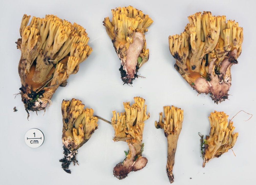 Ramaria broomei (jetzt Phaeoclavulina macrospora) habe ich an diesem Standort 1995 erstmals gefunden - Fund nach Prüfung duch Josef Christan in seienm Ramaria Buch enthalten. Bis jetzt auch der einzige Fund in Ö. Im Feld durch die leuchtend gelben Astspitzen und das röten der Frkp auffällig, mirkoskopisch durch 2-sporige Bas und markante Sporen leicht kenntlich.