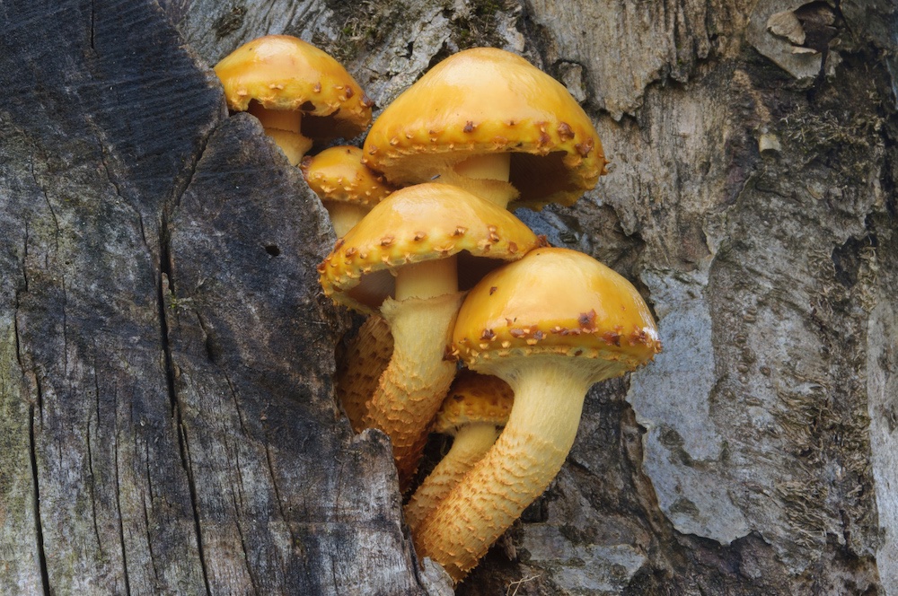 Pholiota limonella – danke an Josef fürs Zeigen. Die Bestimmung erfolgte anhand des Substrates (Eberesche) und der Sporenmaße (< 8 x 4 µm).