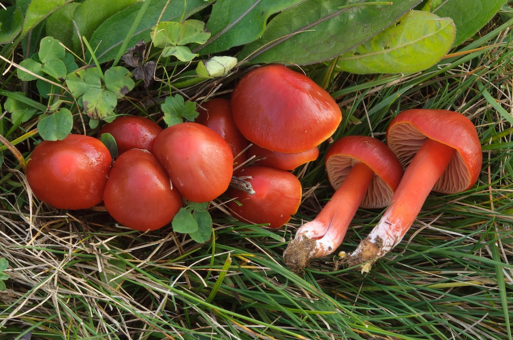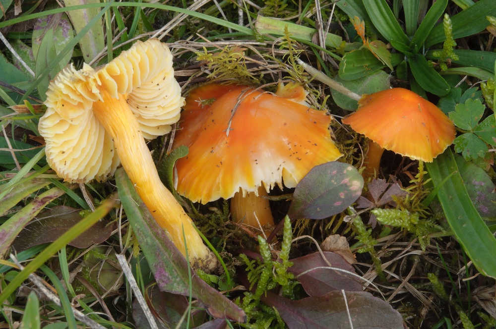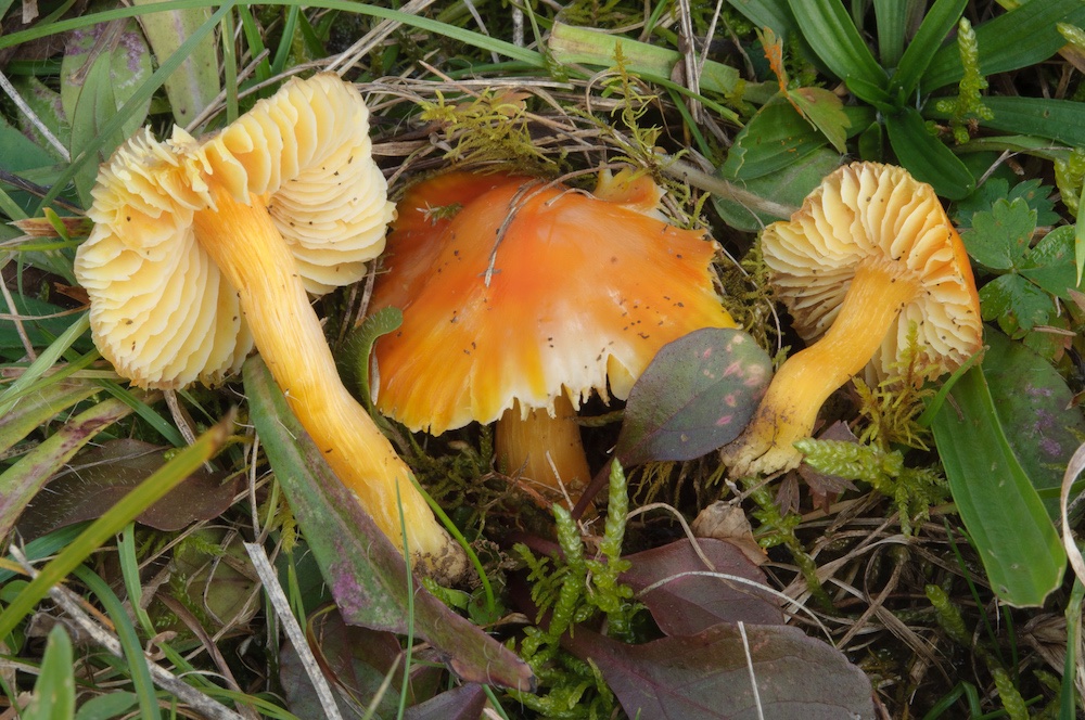 Hygrocybe (cf.) aurantiosplendens: Der Stiel ist vielleicht etwas stark gestreift für diese Art, H. punicea gefällt mir aber weder vom Habitus noch von der Farbe her, und eine andere Art kommt m. E. nicht in Frage...