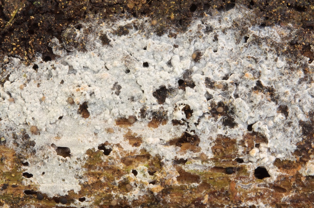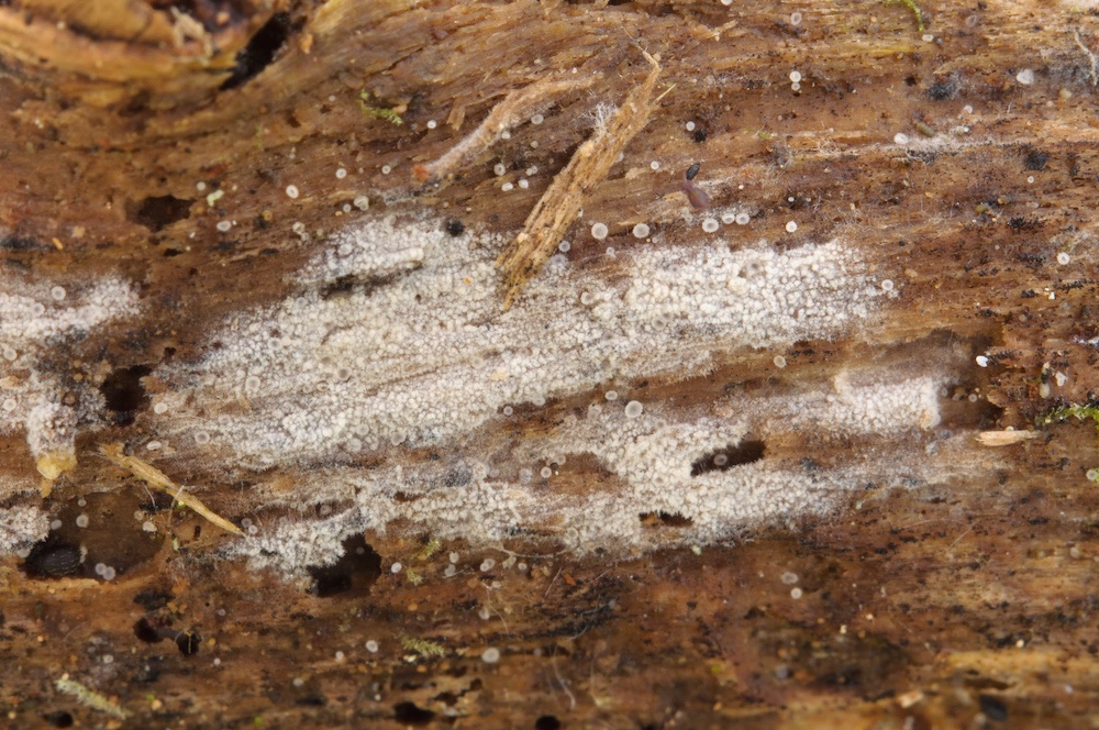 Botryobasidium conspersum: Nebenfruchtform. Liegender Quercus-Ast.