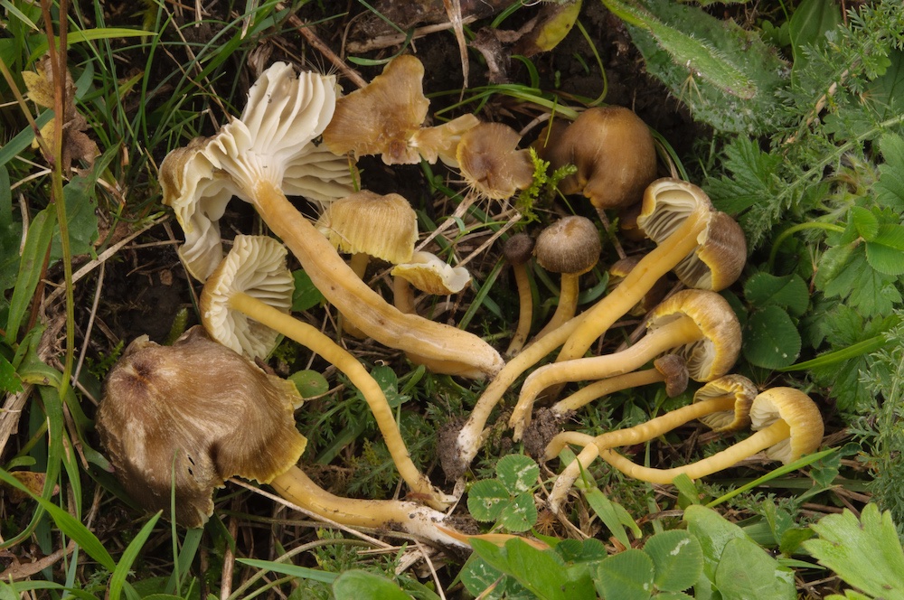 Hygrocybe cf. citrinofusca: Ein ausgesprochen interessanter Fund. Erst nach langer Recherche bin ich auf dieses Taxon gestoßen, das Favre aus der Schweiz beschrieben hat. Boertmann und Bon ziehen eine Synonymisierung von H. citrinofusca mit H. spadicea in Erwägung, obwohl diese Art deutliche Unterschiede zur Originalbeschreibung von H. citrinofusca aufweist, z. B. in der Hutform. Ausgezeichnet stimmt die Hutfarbe überein, so weist Favre auf die jung dunkelbraunen Hüte mit zitronenfarben-bräunlichem Rand hin, welcher hier sehr auffällig war. Auch die Mikroskopie scheint soweit ganz gut zu passen, inklusive der beschriebenen Pseudozystiden. Ob es sich wirklich um dieselbe Art handelt, kann ohne eine Typusstudie aber wohl nicht geklärt werden. Ich habe nur einen einzigen Hinweis auf einen weiteren Nachweis dieser Art seit der Originalbeschreibung gefunden, welchen ich jedoch nicht einsehen kann (Romero de la Osa 2003: Las setas del parque natural Sierra de Aracena y Picos de Aroche).