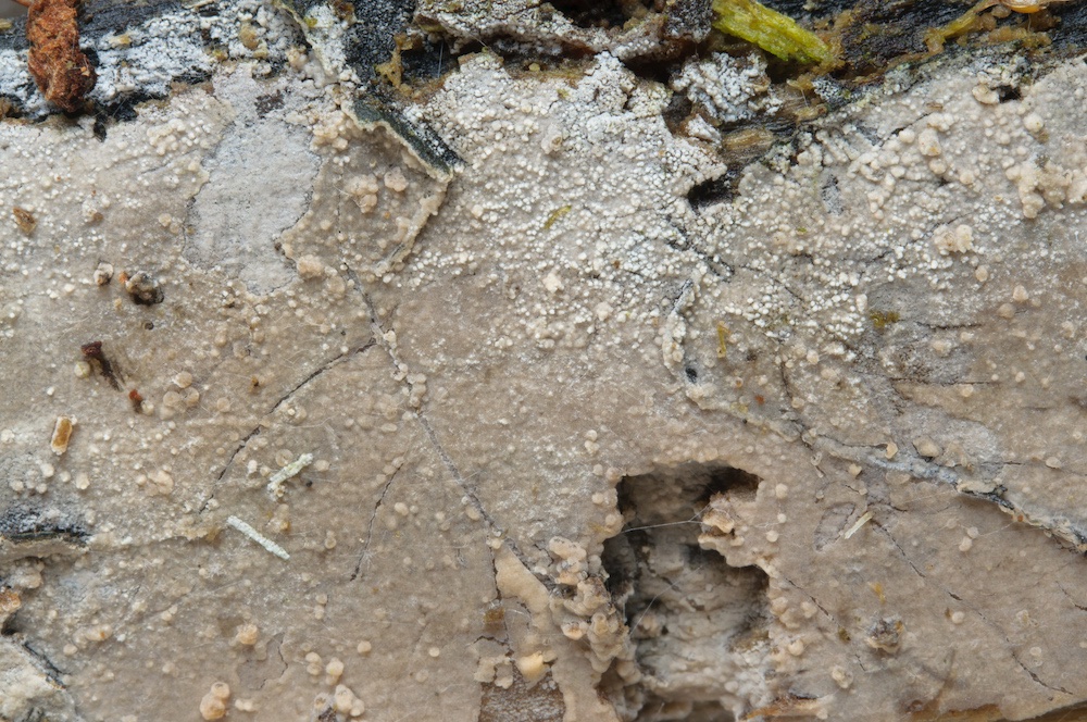 Byssoporia terrestris: Unterseite eines Abies-Stammstücks. .