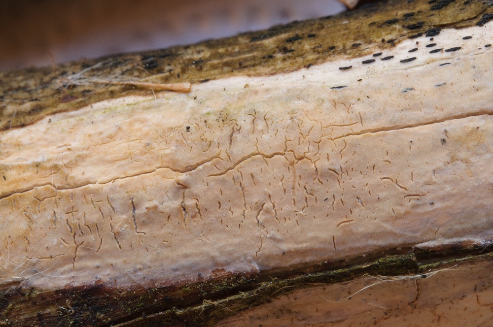 Hypochnicium geogenium: Unterseite eines liegenden Abies-Stammstücks. .