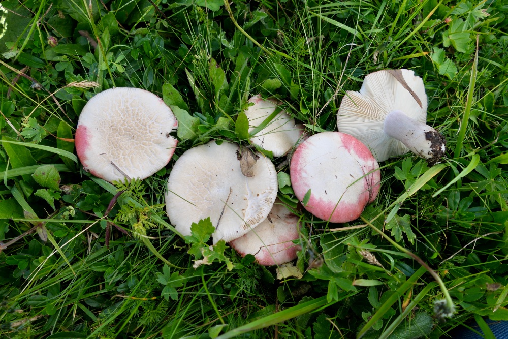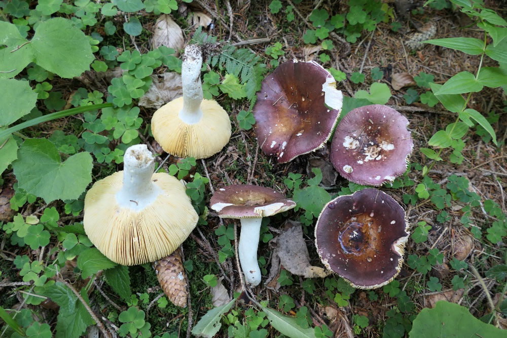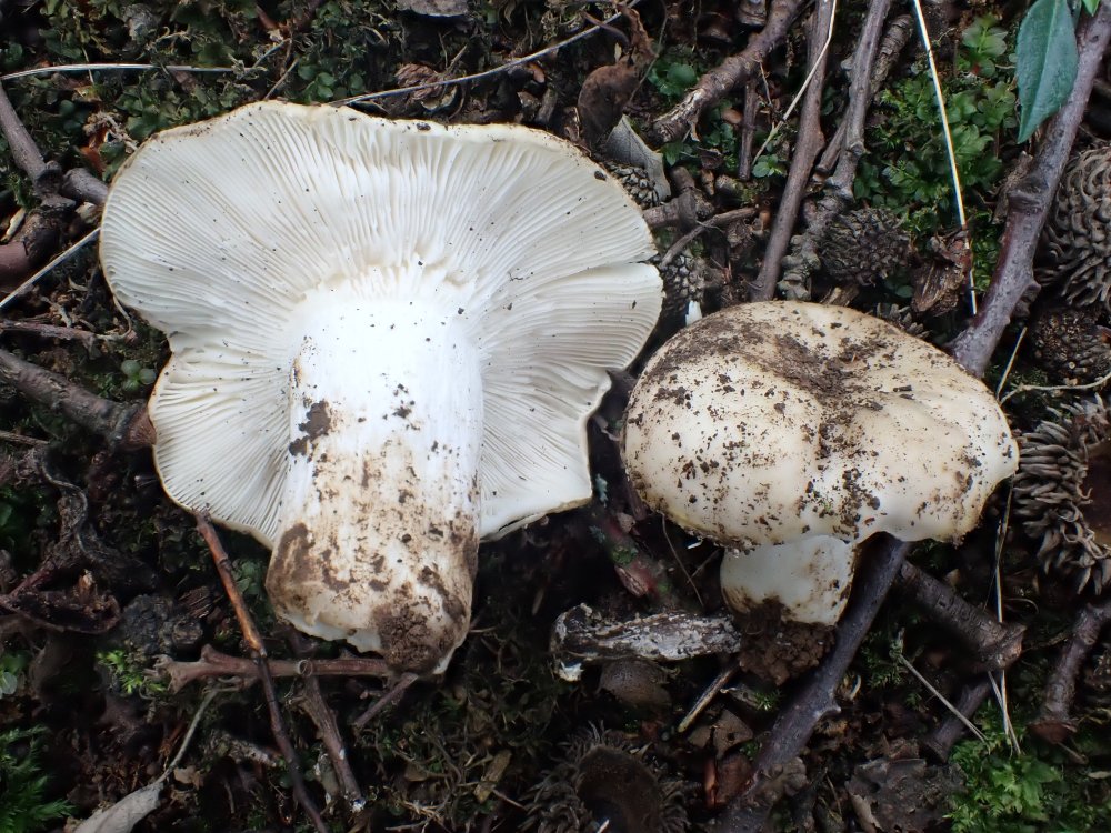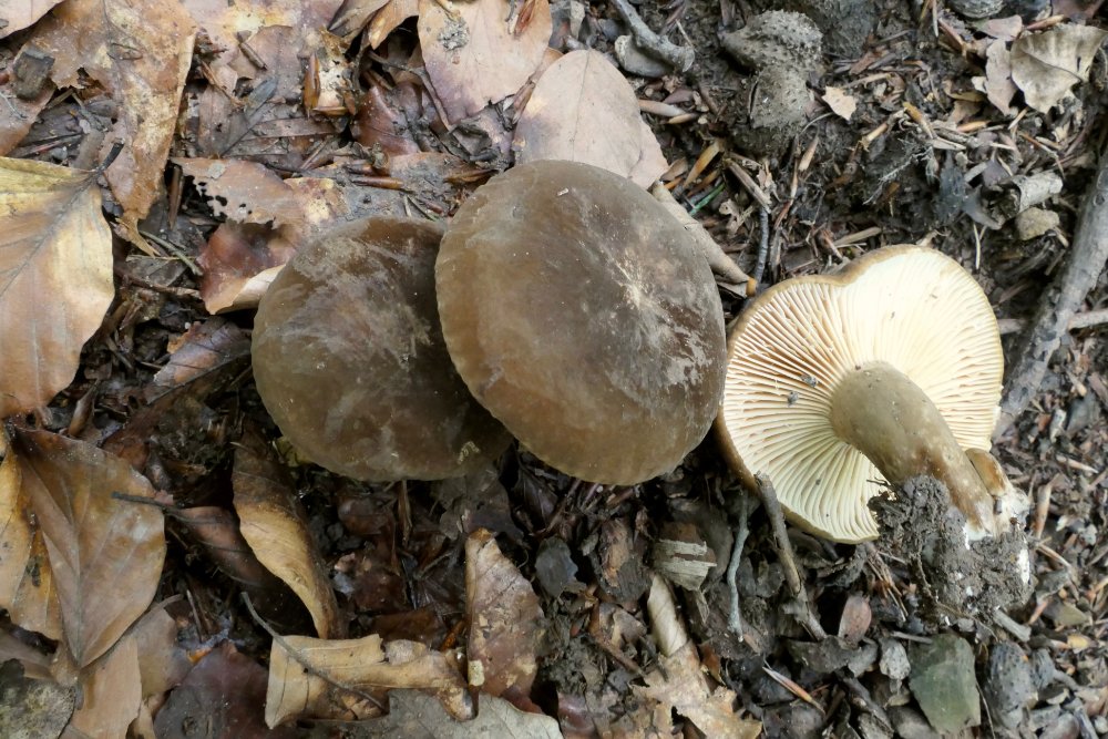 Die Huthaut dieses bei Eiche wachsenden Täublings verfärbt sich von weiß (jung) nach braungrün (alt und trocken)