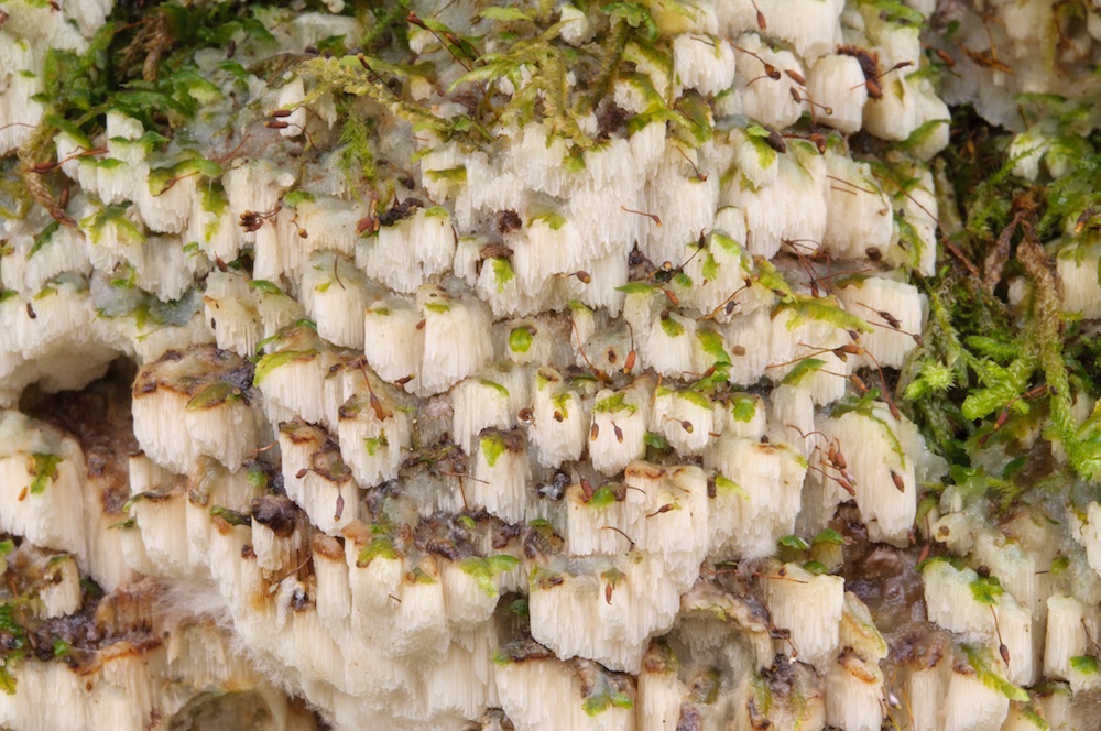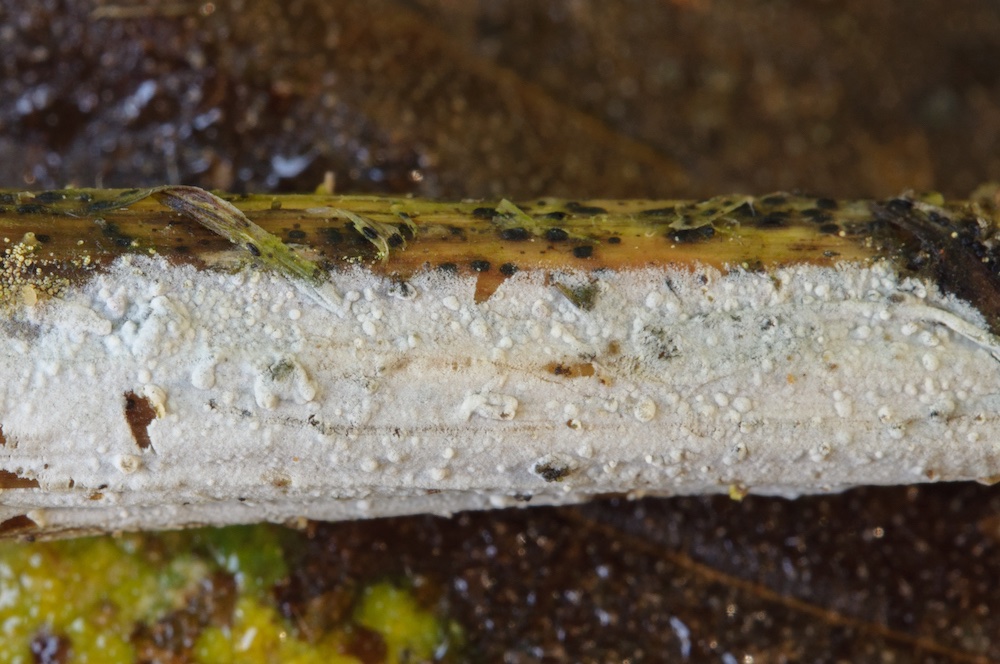 Melzericium bourdotii: Auf einem entrindeten Picea-Ast. .