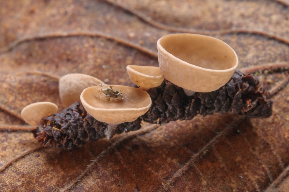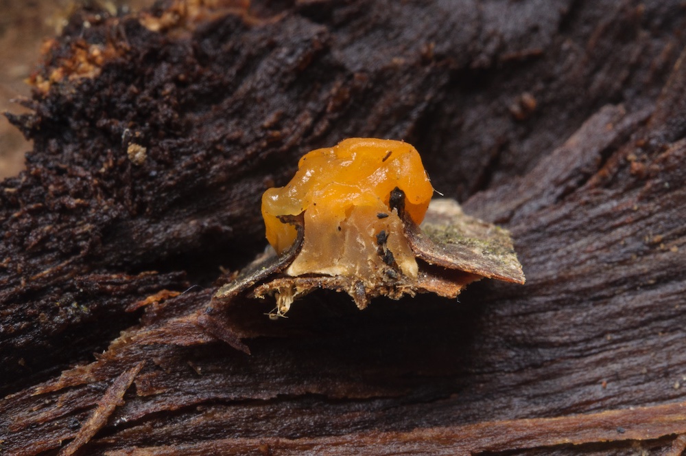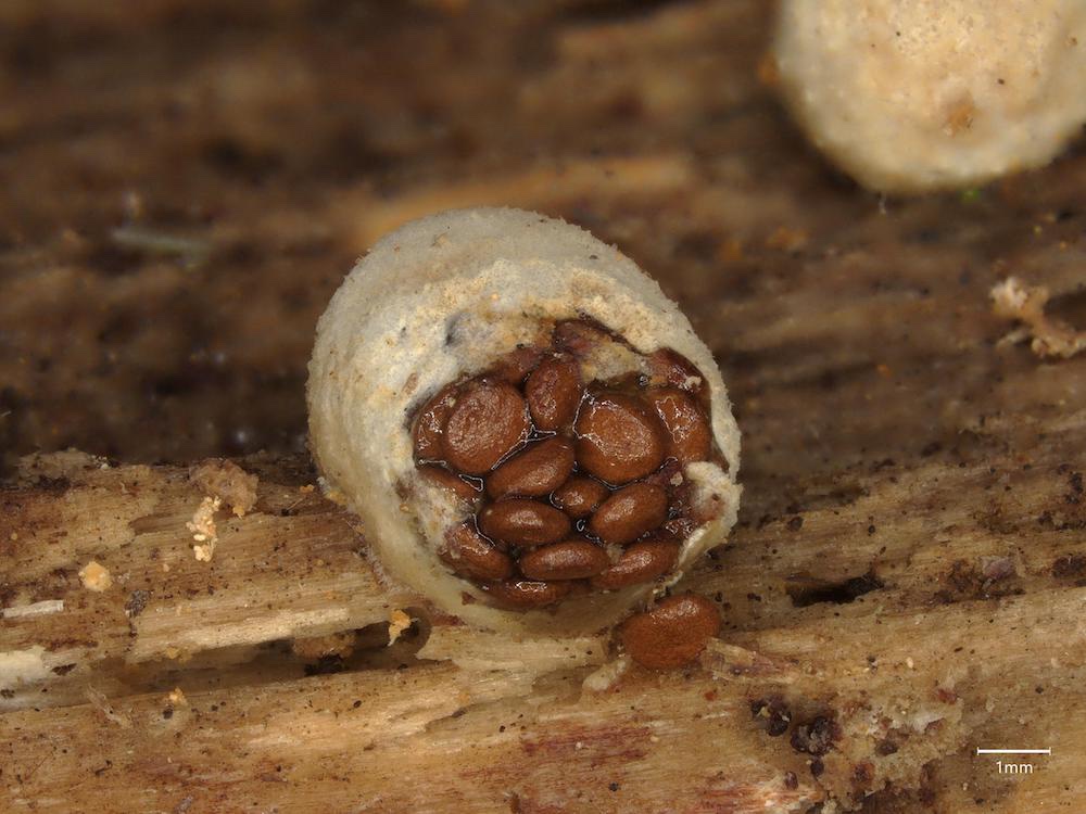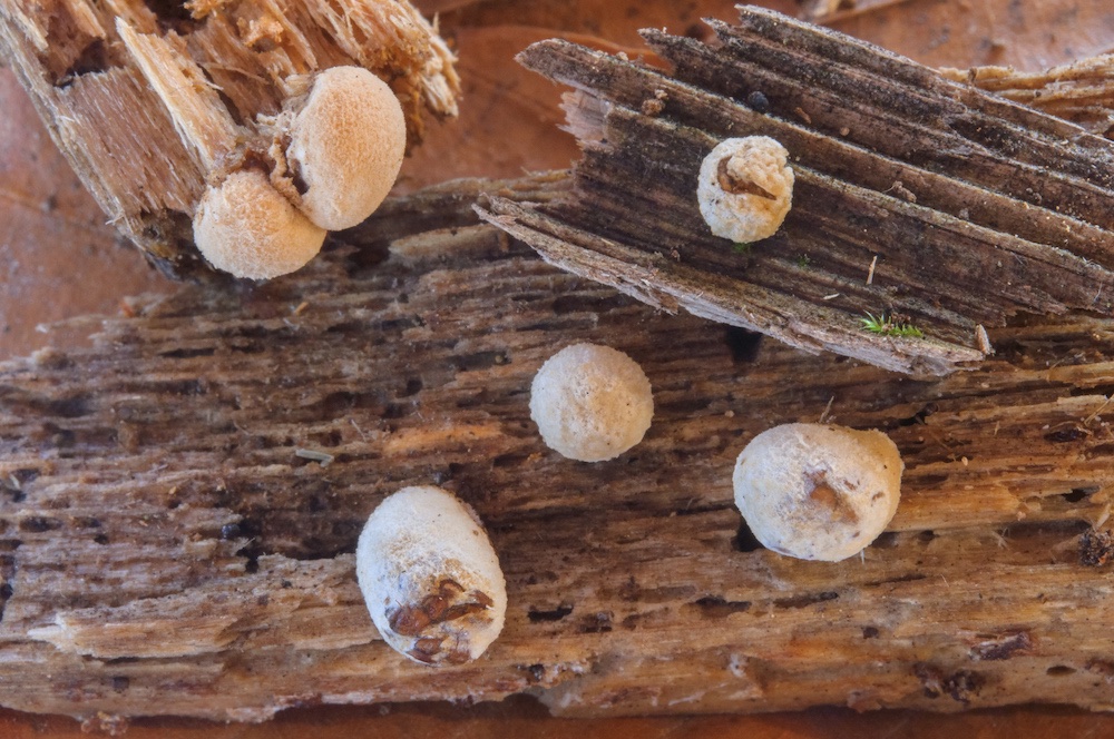 Nidularia deformis: Gestapeltes, morsches Pinus-Holz.