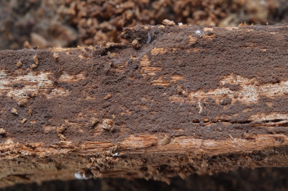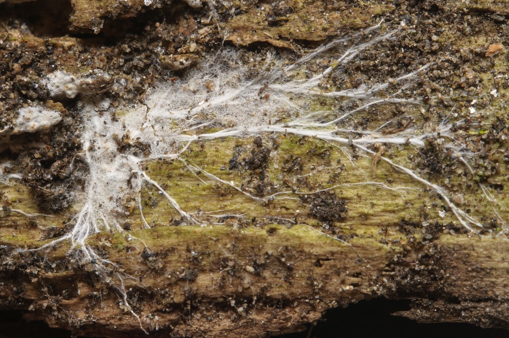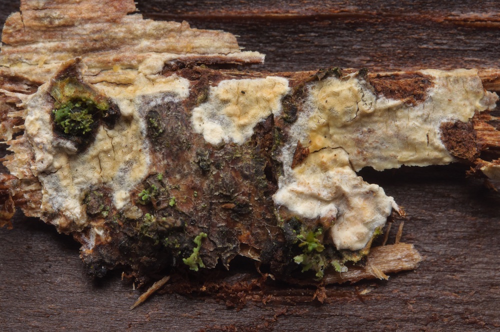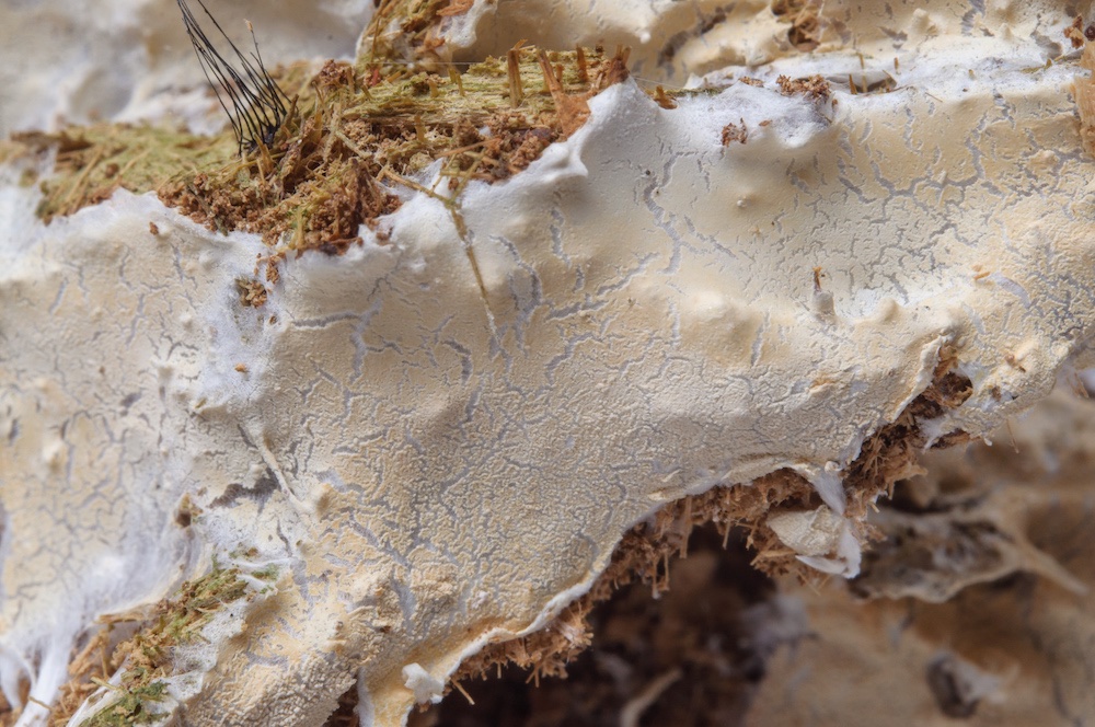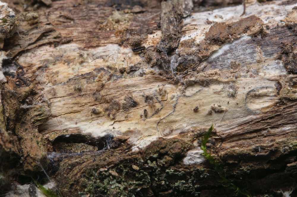 Trechispora fastidiosa: Unterseite eines liegenden Fichten-Strunks. Mit intensivem Geruch nach Mottenkugeln.