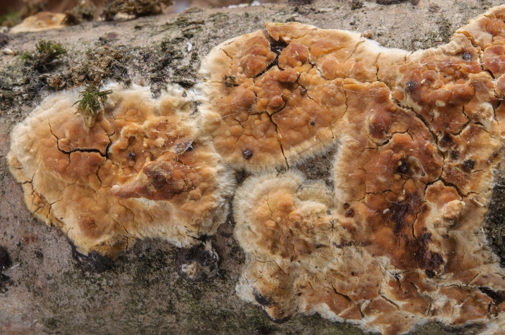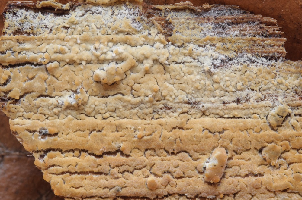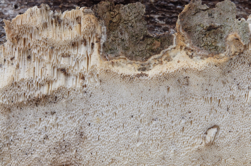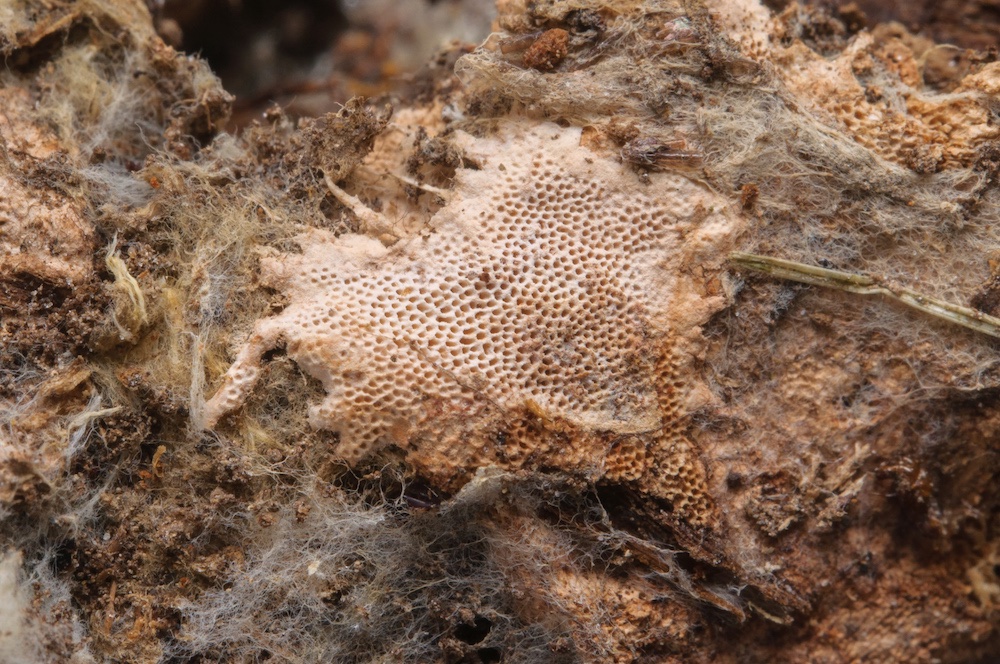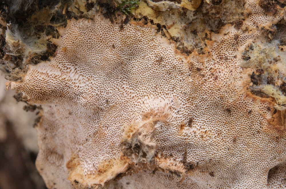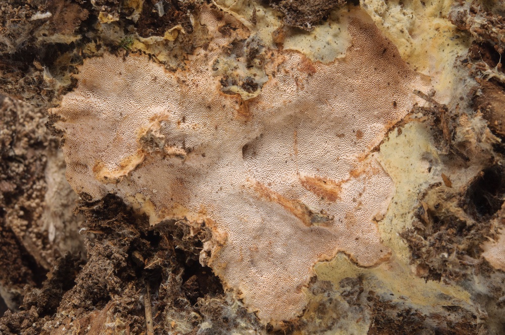Perenniporia fulviseda: Unterseite eines Nadelholz-Wurzelstocks. Noch eine besondere Art, von der es in Europa nur wenige Nachweise gibt.