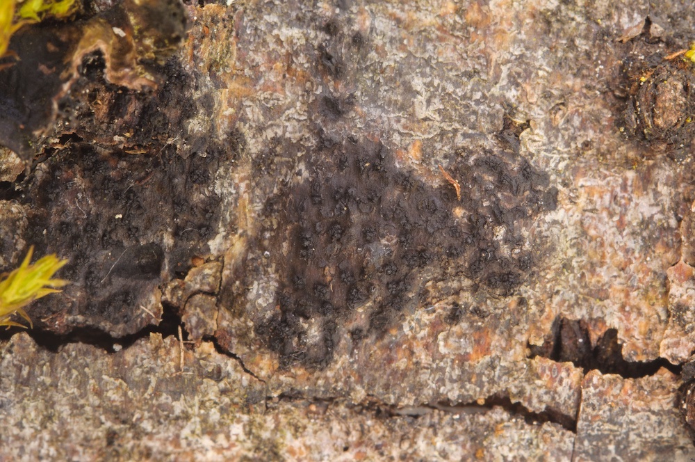 Melaspilea bagliettoana: Liegender Picea-Ast.