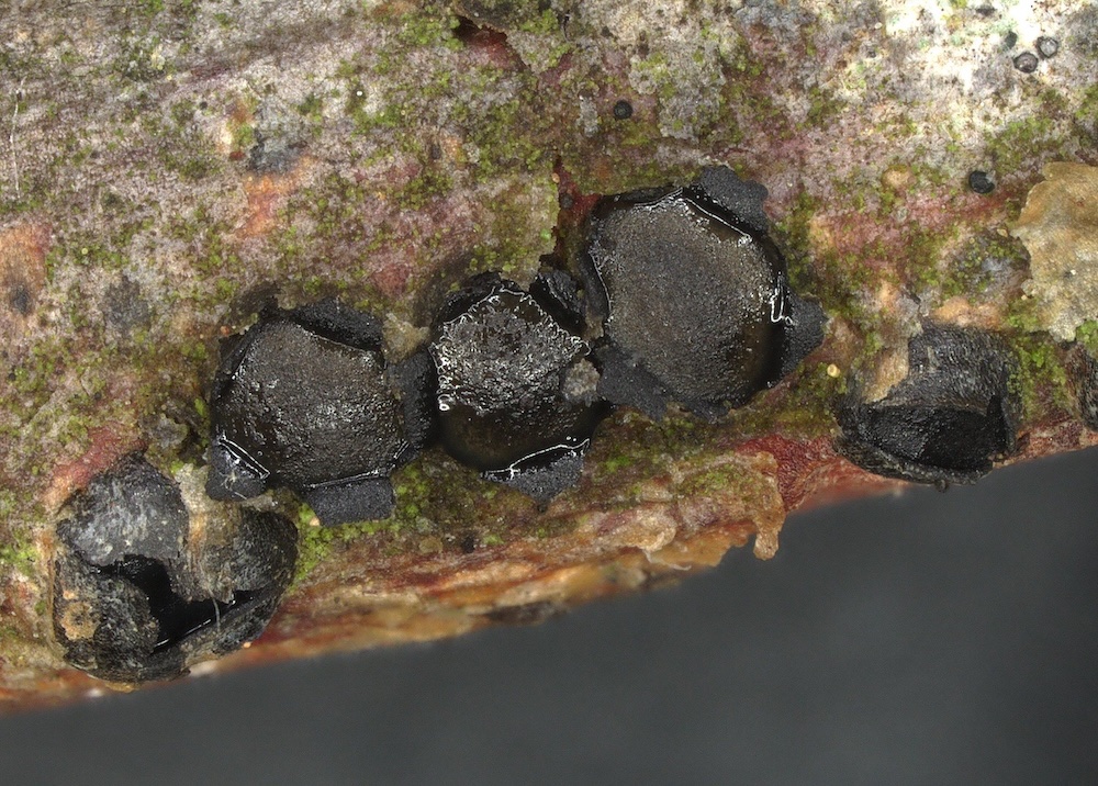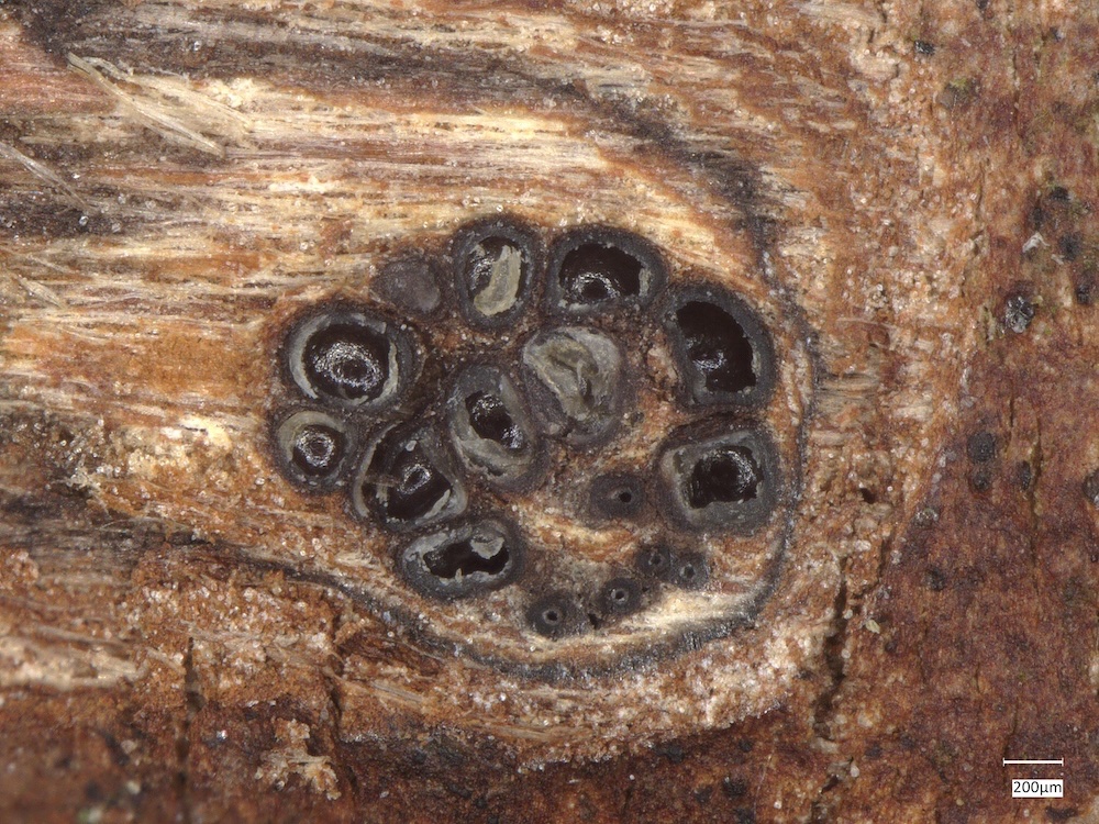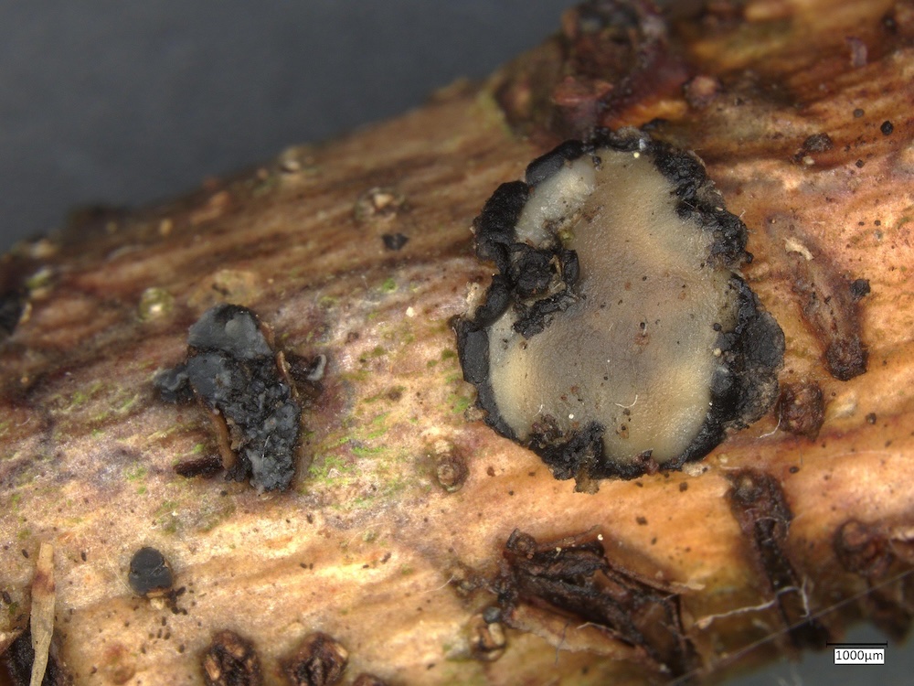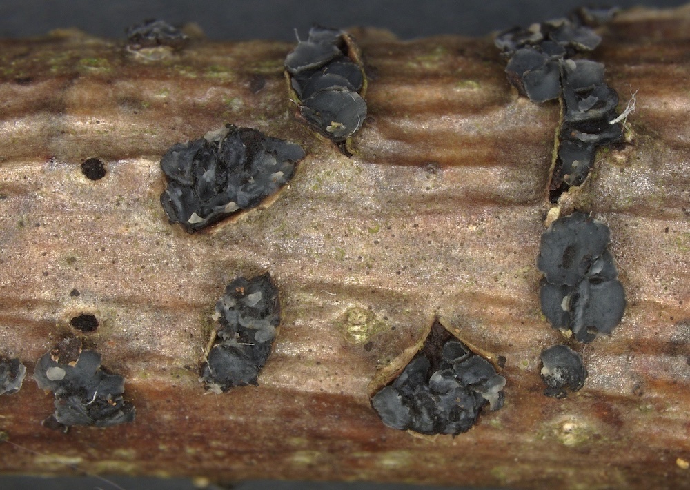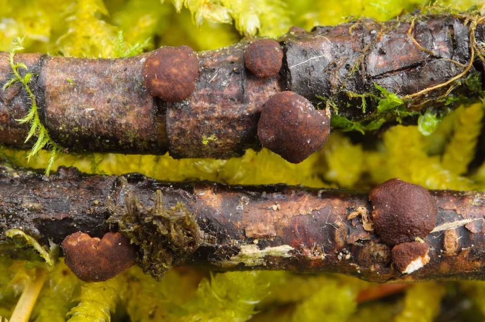 Mollisia sp.: Eine noch unbeschriebene Art, die auf Quercus-Ästen zusammen mit Colpoma quercinum wächst.