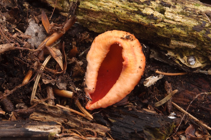 Sarcoscypha coccinea, die durch den Wind leider schon halb vertrocknet war.