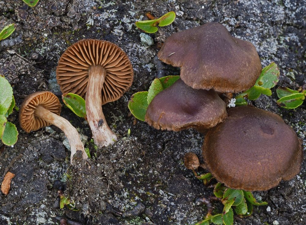 Cortinarius (Tel) auf Rohboden mit Salix herbacea sieht ganz nach C. inops aus - Lamellenschneide mit Zystiden, realtiv dunkel und mit Buckel und bräunlichem V am Hrand und auch am Stiel ohne violette Farben in den L. und im Fl. Cortinarius inops