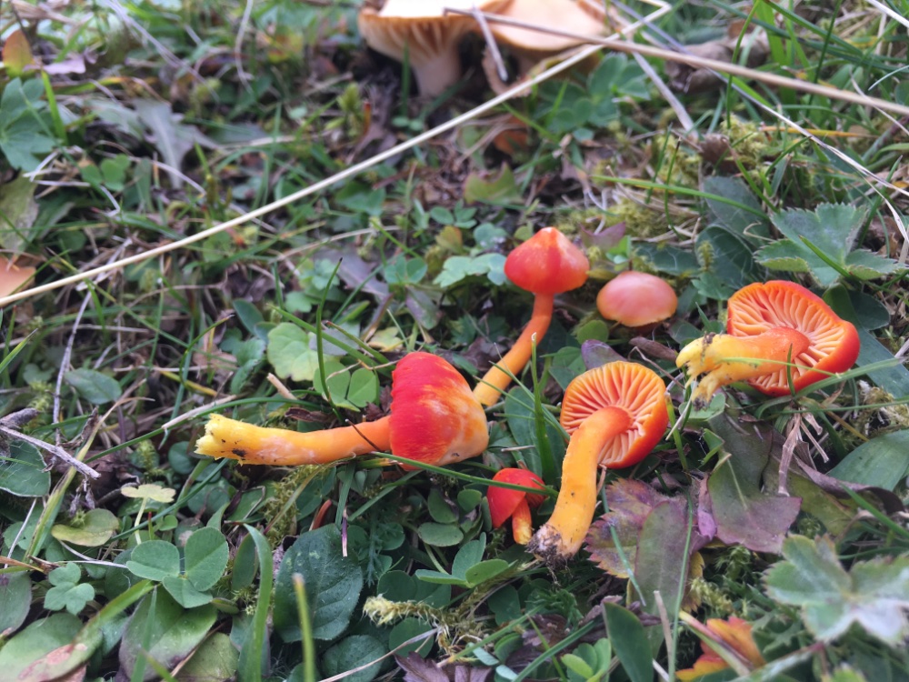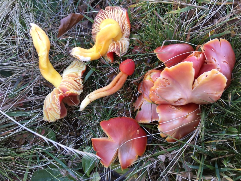 Mir fällt auf, dass dieses Jahr hauptsächlich Arten mit fleischigen, großen Fruchtkörpern anzutreffen sind. Abgesehen von ganz kurzen Zeitfenstern von je 1-2 Tagen waren Arten mit zartem Habitus ziemlich rar, zumindest außerhalb der Feuchteren Standorte. Interessant ist auch, dass einige Arten, die ich letztes Jahr teils in großen Mengen angetroffen habe, in dieser Saison ziemlich ausgelassen haben. Hygrocybe intermedia etwa war im letzten Herbst in jeder besuchten Fläche allgegenwärtig, in diesem Jahr hat sie jedoch nur Ende Juni eine starke Fruchtung gegeben und im Herbst habe ich insgesamt exakt zwei Fruchtkörper gesehen.