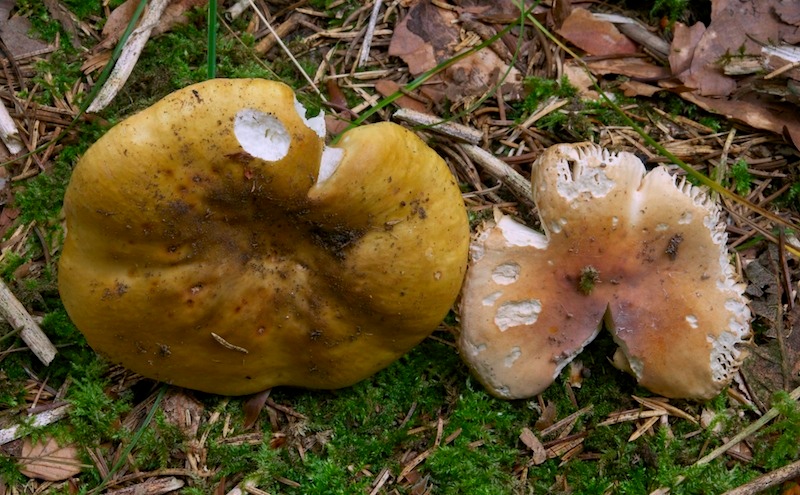 Russula ochroleuca (links) und Russula fellea (rechts)