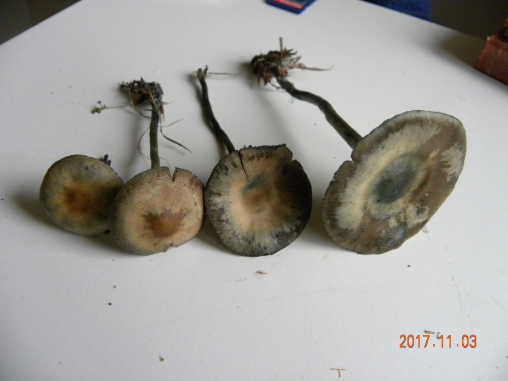 Hüte jung braun, glockig; älter graubraun und flach werdend bis aufgewölbt und stark gerieft, hygrophan, vom Rand ausblassend mit Blauverfärbungen,