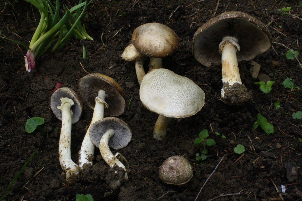 Das bedeutet also, dass flächendeckend eine große Sporenbank vieler Arten im Boden vorhanden ist! Bei geeigneten Bedingungen (Temperatur, Feuchtigkeit, Nährstoffgehalt, etc.) können diese dann rasch keimen und ein Massenauftreten bewirken. Das wäre meine Erklärung für das großflächige Auftreten der Champignons. Das lokale Auftreten des Träuschlings hat ev. schon auch den Hintergrund, dass der Bauer eve. durch Düngung Stroh gleichmäßig in den Boden eingearbeitet hat, das vom Myzel des Träuschlings durchwachsen war. Die Volvariella „wartet“ sicher auch im Boden überall.
