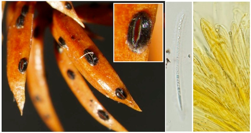 Abschließend möchte ich noch eine hübsche Spaltlippe auf Alpen-Wacholder zeigen, die den passenden Namen Lophodermium juniperinum trägt. Ich fand sie auf abgestorbenen Nadelbüscheln im Inneren der Sträucher.