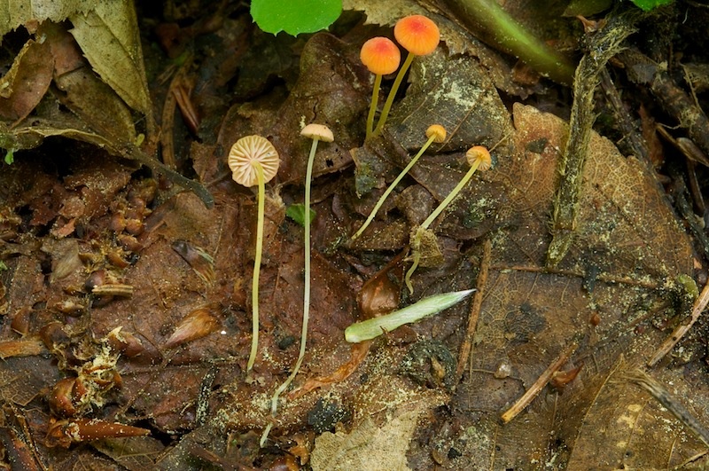 Fast direkt daneben wuchs eine weitere häufige Art, die ebenfalls kleine und zarte Fruchtkörper hat, aufgrund ihrer Farbe aber leicht zu entdecken ist.