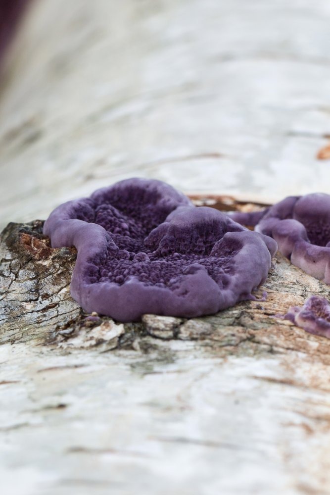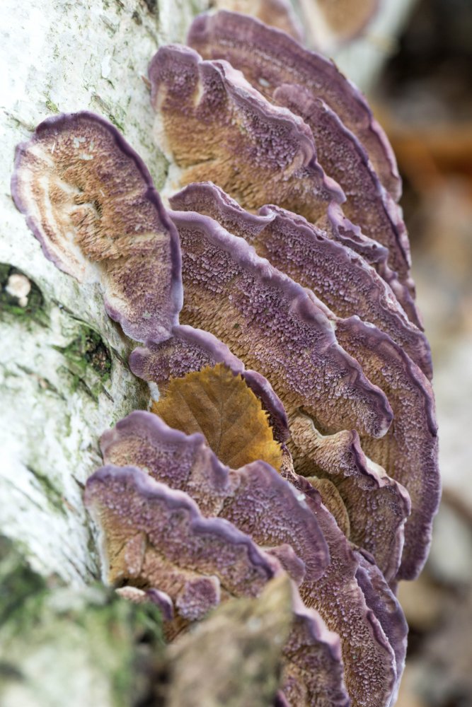 Trichaptum biforme kann offensichtlich einen ganzen Stamm violett einkleiden: