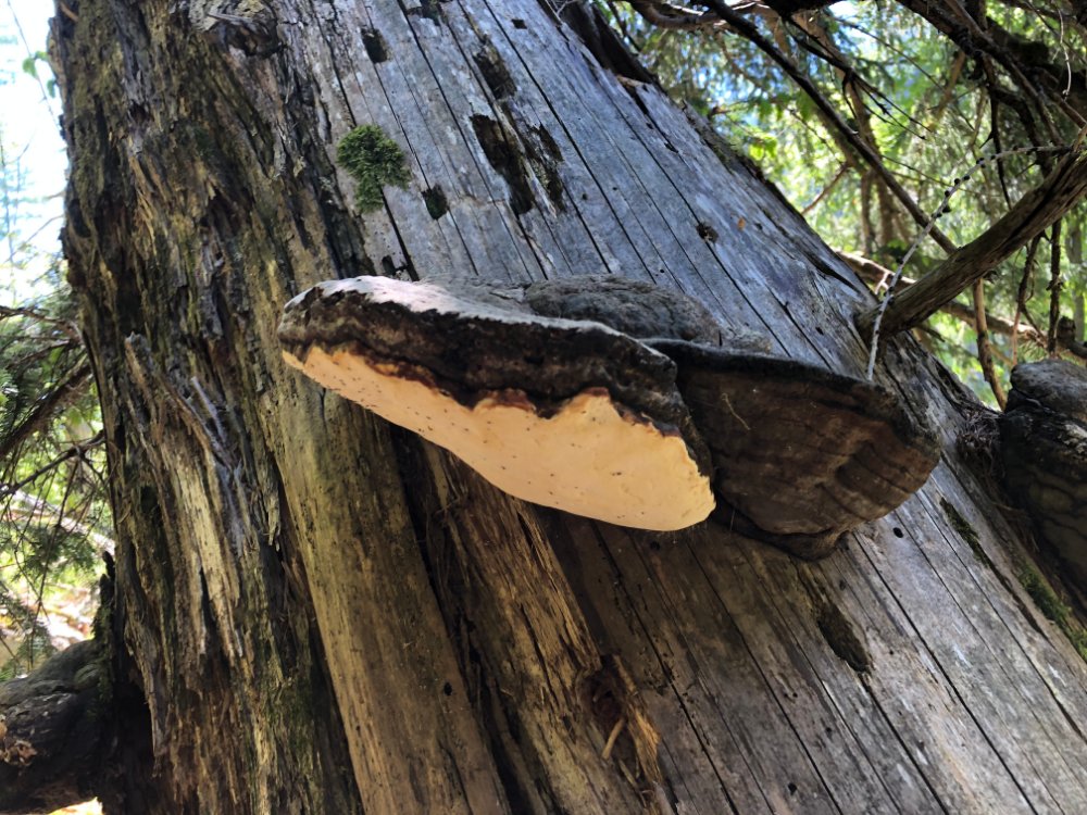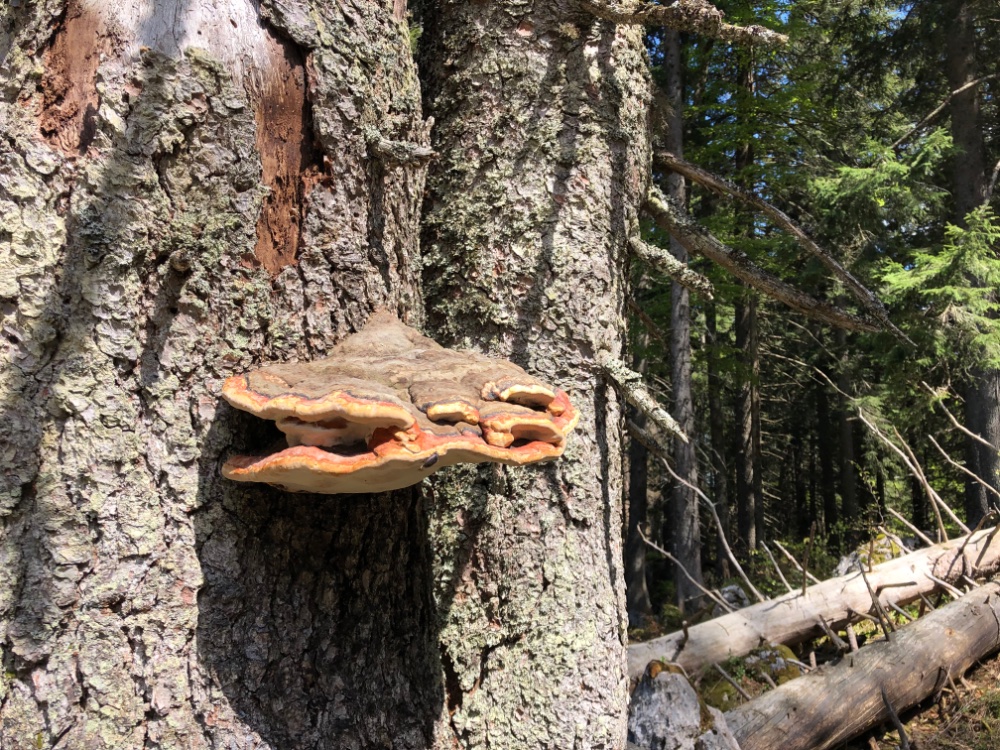Den Fomitopsis-Stamm muss zweimal eine Lawine mitgenommen haben und dazwischen ist er wohl mit dem Wurzelteller nach oben gelegen. Aktuell steht er wieder auf den Wurzeln, weshalb ich anfangs etwas verwirrt war