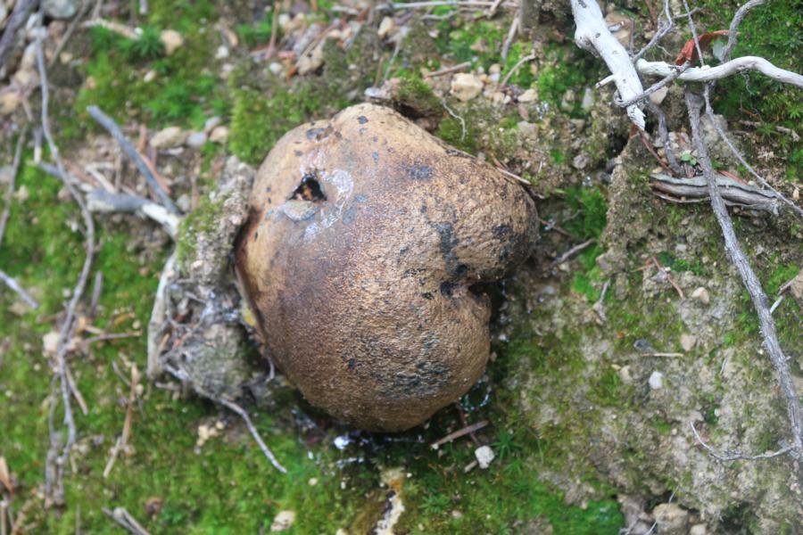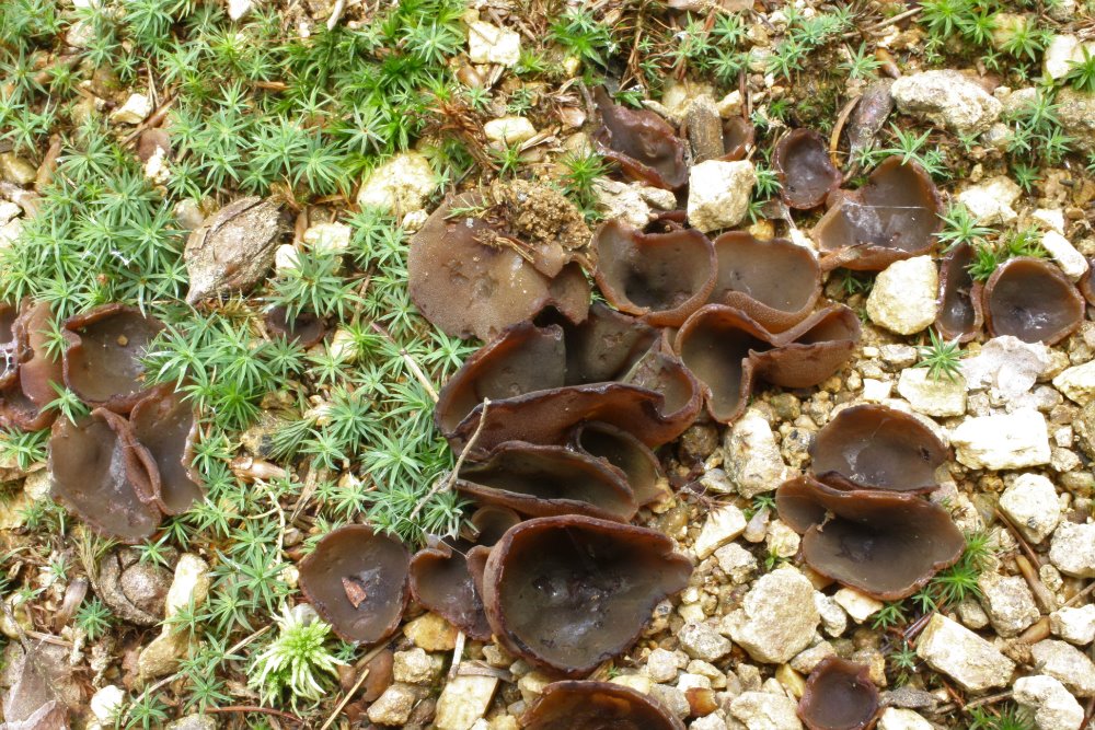 Peziza badia - kastanienbrauner Becherling - zahlreich auf einem Waldweg und stark sporulierend - richtige Staubwolken haben diese Becherlinge losgelassen: