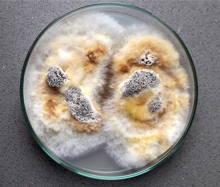 Nachdem die Petrischale etwa zu dreiviertel besiedelt ist, bilden sich Ansätze der originalen Fruchtkörper, die man