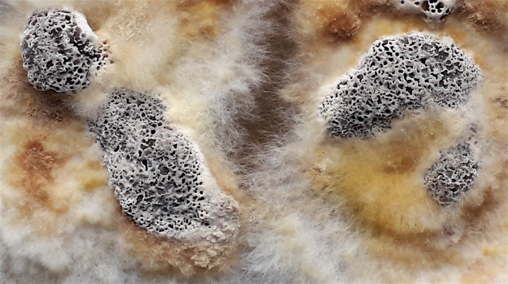 Das Myzel ist zuerst weiss und nimmt dann die Farben an, wie man sie auch im Inneren der sterilen Fruchtkörper findet.