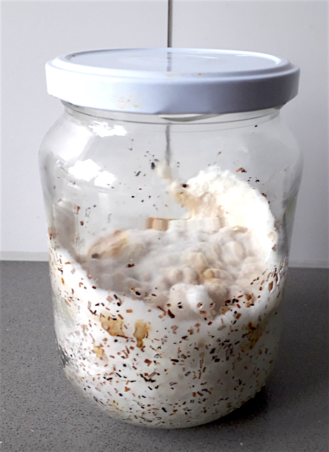 Ich habe auch eine Kultur angelegt auf der Basis von Getreidekörnern und Sägemehl.
