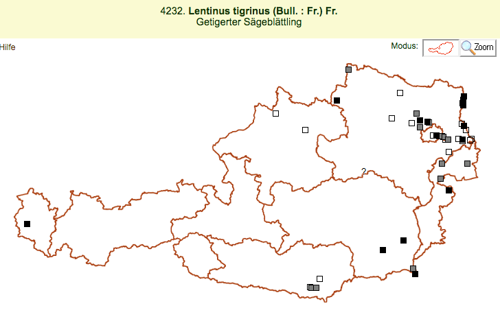 Weil Lentinus tigrinus pharmakologisch interessant ist, habe ich eine Kultur angelegt. Auf der Karte sieht man, dass diese Art in Österreich