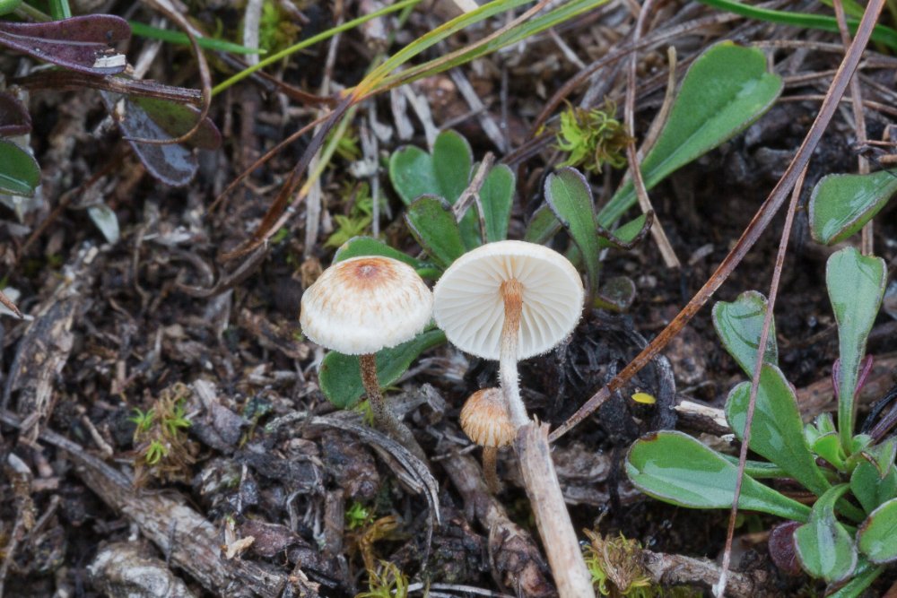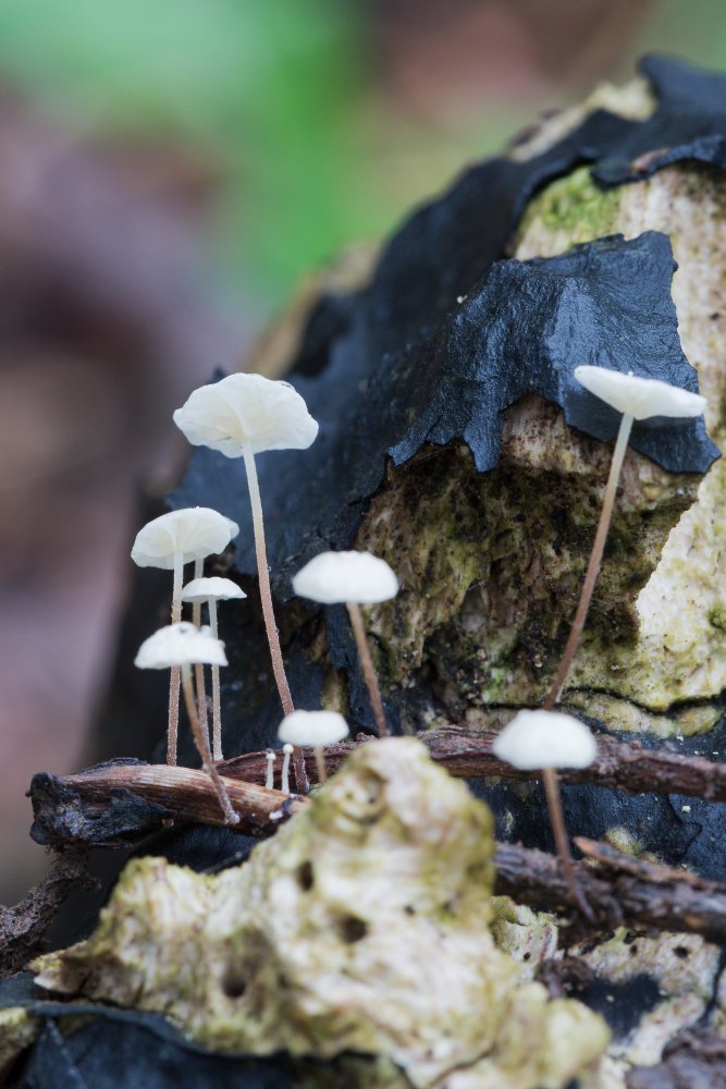 Eine kleine Schönheit auf dünnen Ästchen ist Marasmius epiphyllus: