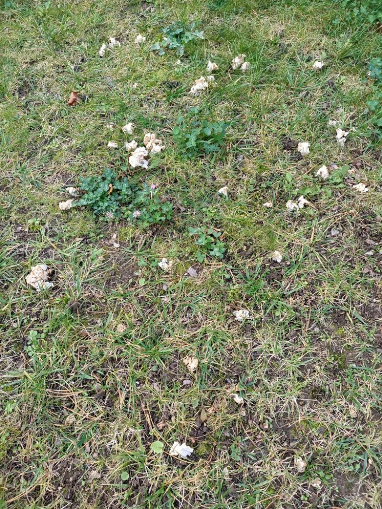 Selber Standort (unter Föhren, auf Kalk), jedoch eine Spur weniger unter den Föhren, sondern dort, wo der Boden nicht mehr ganz bedeckt ist. Eine Föhre ist dort vor < 1 Jahr gefällt worden. Nicht sicher, aber als ob sie entlang von Wurzelsträngen des gefällten Baumes wachsen würden, die Anordnung lässt eine radiale Ausstrahlung vom Stumpf erahnen. Zuerst in situ, dann Details: