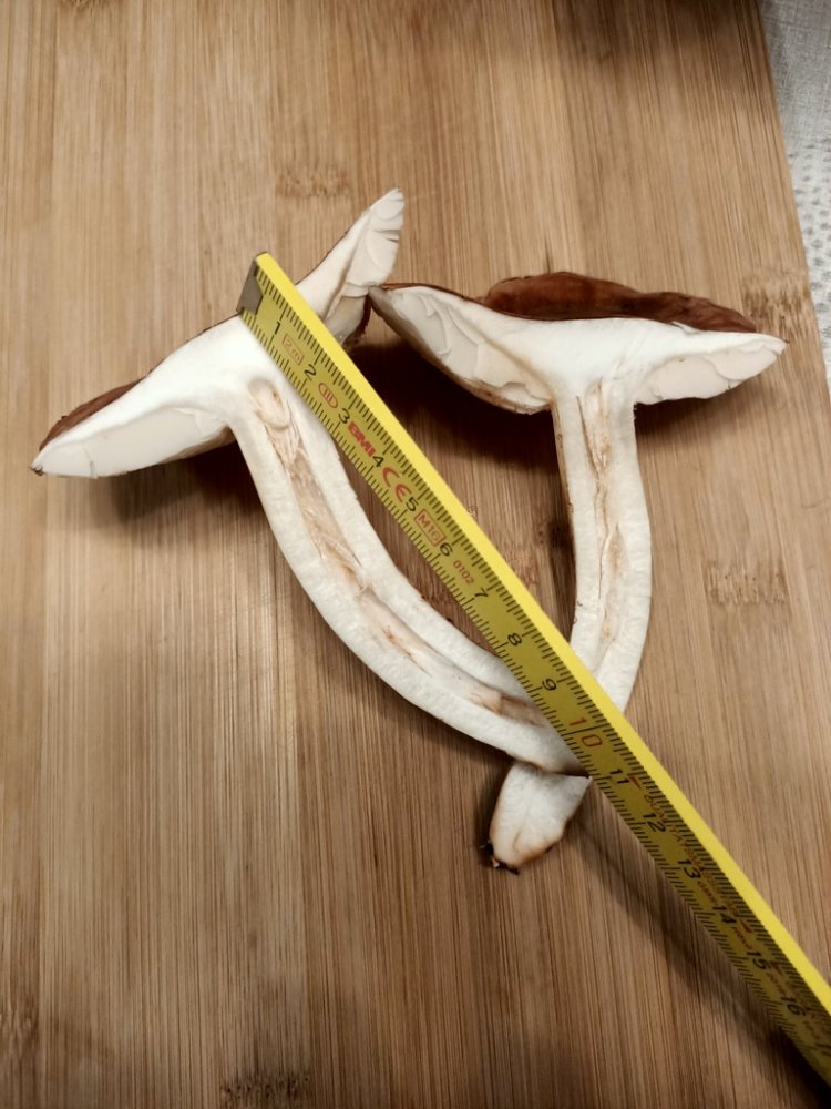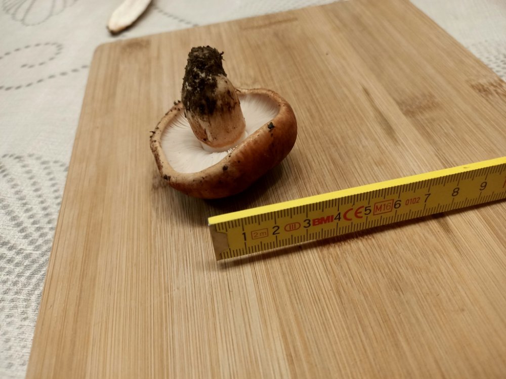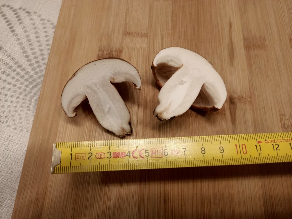 Nach ein paar Tagen beobachtet: Die Schnittfläche des Stieles, dort wo es nicht "wattig" war hat sich über ein paar Tage ganz leicht bräunlich verfärbt, das wattige blieb reinweiß. Hutfleisch kaum angefärbt, fast vollständig weiß geblieben, Lamellen an den Rändern auch leicht gebräunt.