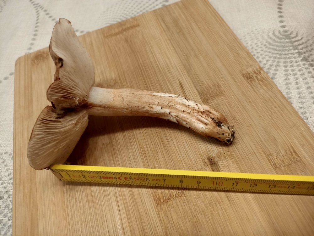Die Exemplare wurden mit jenen oben am gleichen Tag gesammelt. Deutlich unterschiedlicher Merkmal ist, dass hier 6-7 Fruchtkörper auf ca. 4 m² einzeln standen (im Gegensatz zu oben, welche in ganz dichten, markanten Sträußen), und dass sie alle deutlich größer als zum selben Zeitpunkt die obigen) waren. Der Stiel ist nicht wattig, sondern hohl.